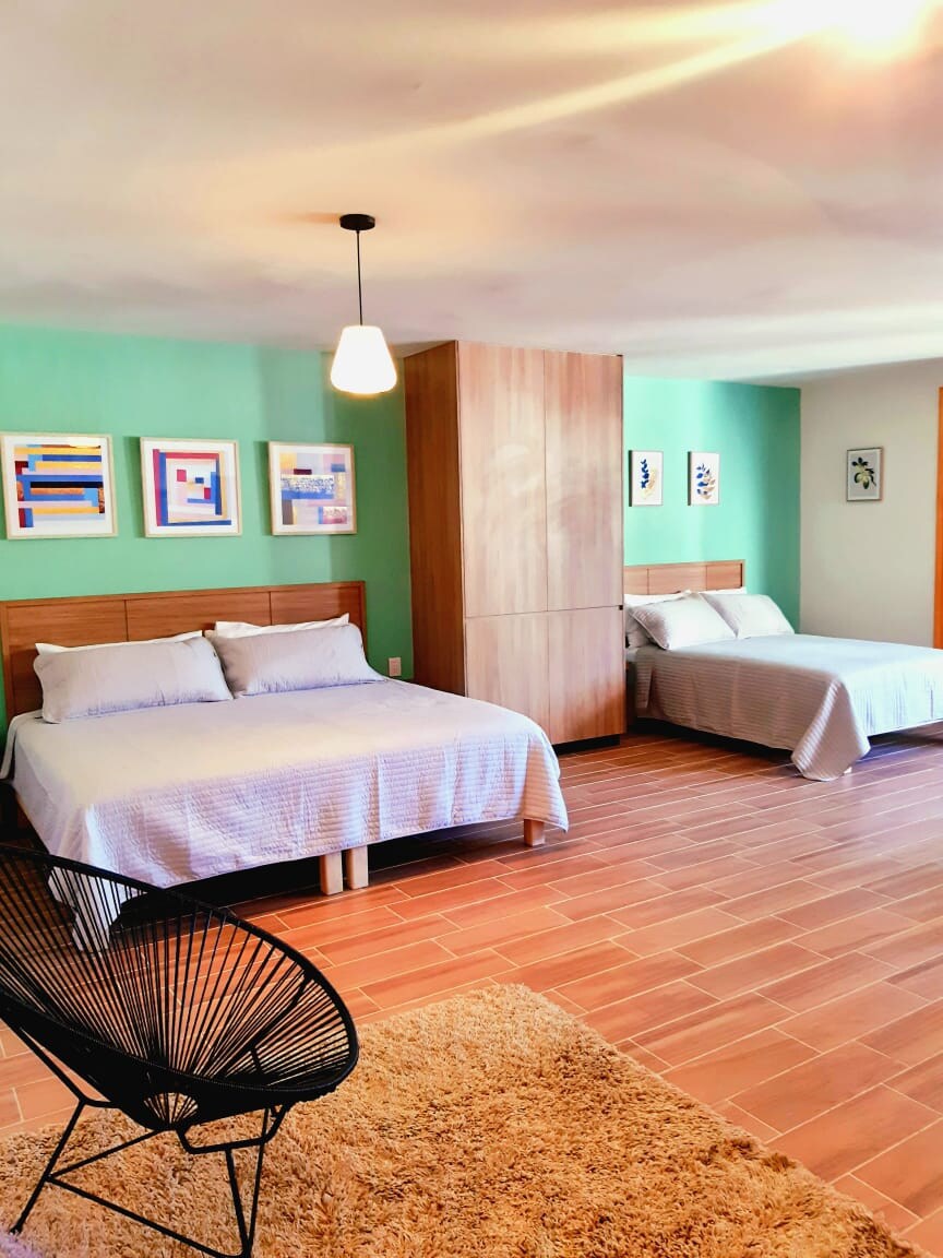 Increíble departamento de un solo piso, estilo étnico contemporáneo, piezas artesanales complementan su original decoración. Diseñado para ofrecer a sus huéspedes una estancia cómoda, funcional y acogedora. Tiene todo lo necesario para hacerte sentir como en casa, con dos encantadoras habitaciones equipadas con camas queen size, sala comedor, baño, cocina equipada y un amplio estacionamiento. Ubicado en un barrio muy tranquilo, a 10 minutos en taxi del centro de la ciudad o 40 minutos caminando.