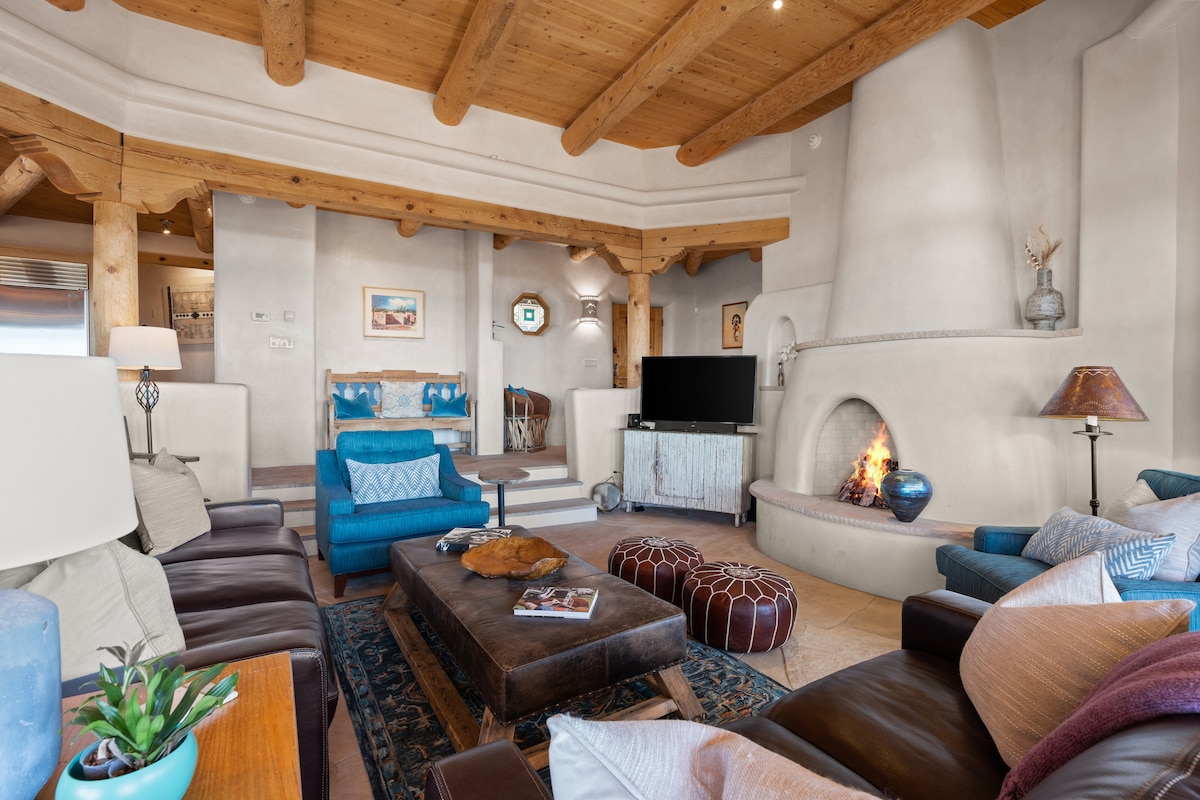 이 5층 4베드룸 2욕조 아티스트 휴양지는 포스트 모던 스타일, 편안함, 전통적인 매력을 조합하도록 새롭게 리모델링되었습니다. 집의 5층에서 멋진 일출, 일몰, 별 구경을 즐기며 대형 벽난로의 따뜻함을 즐겨보세요. 강바위로 둘러싸인 샤워실, 독특한 타일 액센트, 나무 질감과 마감재의 따뜻함이 특별한 디자인 감각을 더합니다. 유서 깊은 산타페 플라자까지 단 15분 거리에 있는 이 숙소는 아름다운 안뜰과 주차 공간이 넉넉합니다.