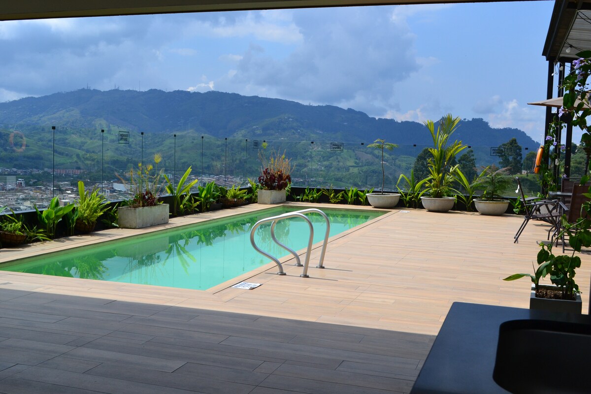 Welcome to our cozy studio in Santa Rosa de Cabal! Nestled in a modern building just 5 minutes from the town center, this space offers the perfect blend of comfort and convenience. Enjoy access to a stunning rooftop featuring a gym, swimming pool, BBQ area, and breathtaking views of the town. Whether you're here to relax, explore, or work remotely, this studio provides everything you need for a memorable stay in the heart of Colombia's coffee region.