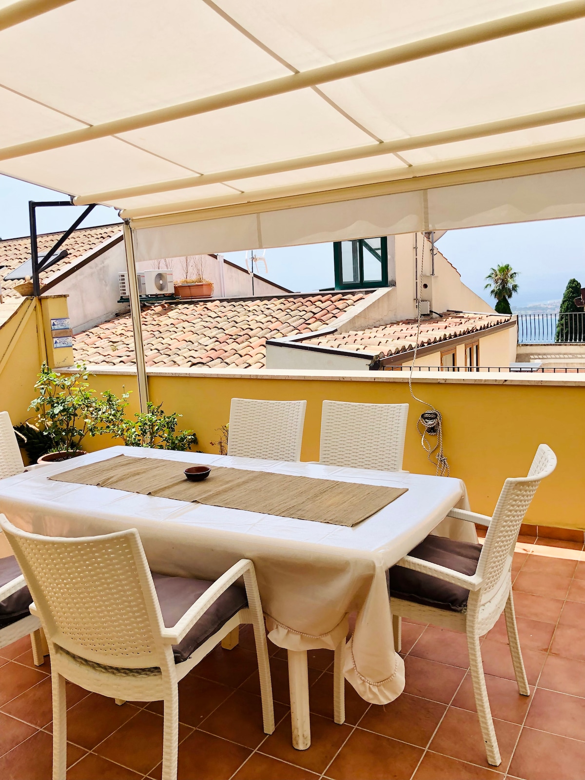 Etna Apartment is a small, well-furnished 28 sqm studio apartment composed of a single room with kitchenette and a small toilet with shower. It is surrounded by a large panoramic terrace of 65 sqm where you can admire the beauties of Taormina: Etna, the bay of Giardini Naxos and Castelmola. Etna Apartment is a 5- minute walk from the historic center of Taormina. It is the ideal place for couples, and no, who want to spend a romantic and unforgettable stay.