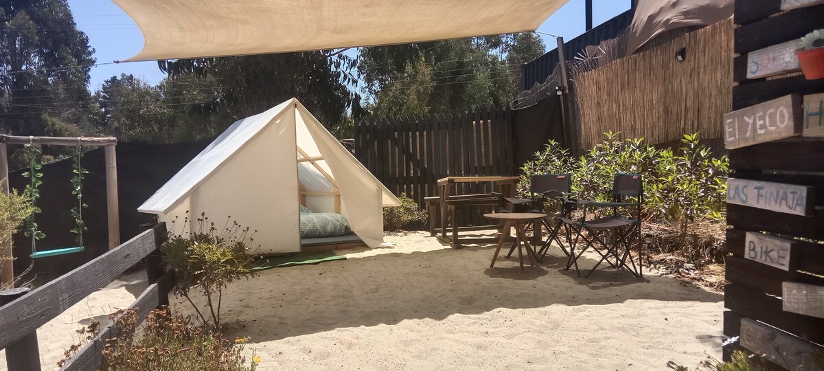 Camping para dos personas lugar totalmente privado no compartido para venir a descansar a la playa cuenta con colchón inflable de 2 plaza, baño al aire libre , cocina totalmente equipada para cocinar , cooler para guardar comida igual se puede guardar en refrigerador con los dueños. a 5 minutos de la playa de algarrobo norte en auto al centro de algarrobo a 10 minutos