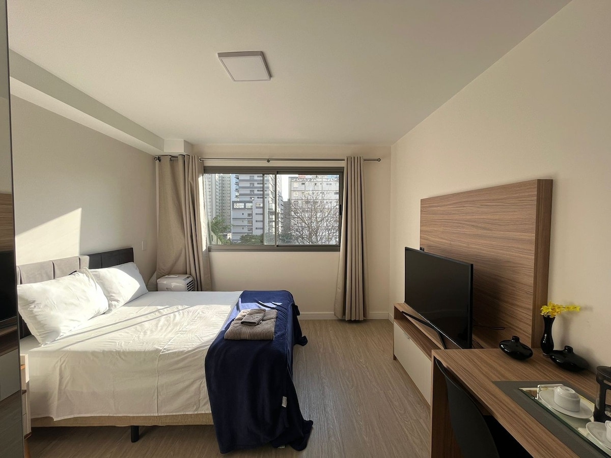 Modern Studio in São Paulo! Located a block from Brooklin subway station and next to Carrefour. New building with 24-hour concierge, electronic lock, and pool. The studio includes a fully equipped kitchen, premium TV channels, air conditioning, and a comfortable double bed. Close to shopping malls, parks, and attractions. Easy online check-in and guaranteed security. Book now and enjoy the best of São Paulo with comfort and convenience!