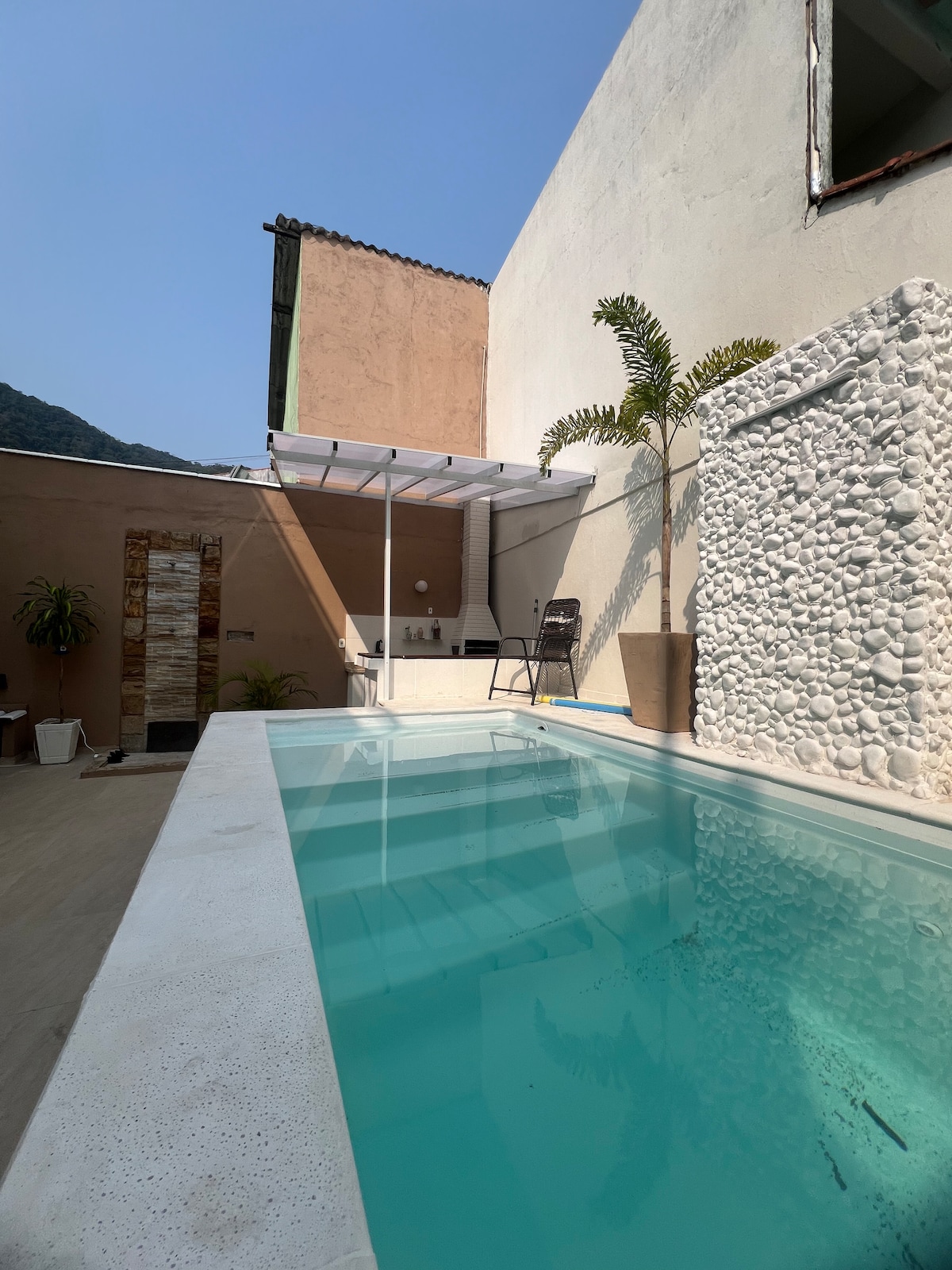 LINDA CASA DE PEDRA para 9 pessoas, em Mangaratiba, em condomínio fechado (cond. Guity). Cachoeira privada com churrasqueira coberta ao lado e um espaço para fogueira.Vista total para o mar e a 50 metros de distância de uma praia com águas calmas, exclusiva do condomínio, ideal para crianças e idosos e para a prática de esportes como natação, stand up paddle e caiaque*. A casa tem 3 quartos com ar condicionado, 3 banheiros, sala ampla e varanda. Internet super rápida: 500MG *aluguel disponível