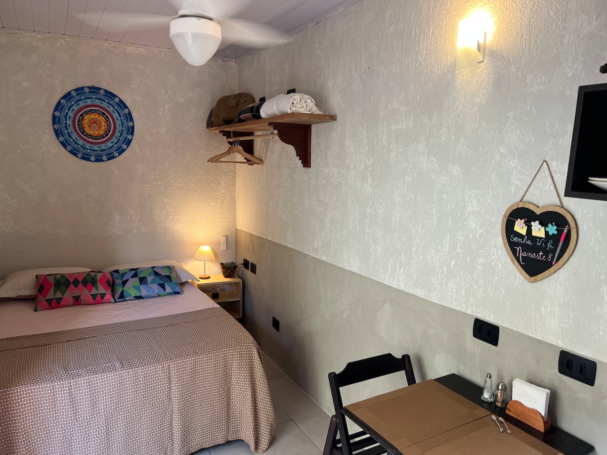 A suíte Ganesha está a 800 m do mar - a pé, 10 min (Enseada, perto do Tortuga). Repaginada agora 2025, para uma experiência gostosa, a sós ou a 2, preza privacidade e recebe c/ aconchego e charme hóspedes de todas nacionalidades. Decoração rústica, cama de casal, ventilador c controle remoto , abajur+luz indireta, geladeira, microondas,banheiro privativo c/ chuveiro elétrico, mesa c/ 2 cadeiras, cafeteira elétrica +pó de café Área externa: mesa c/2 cadeiras, guarda sol Acomoda c/ conforto até 2