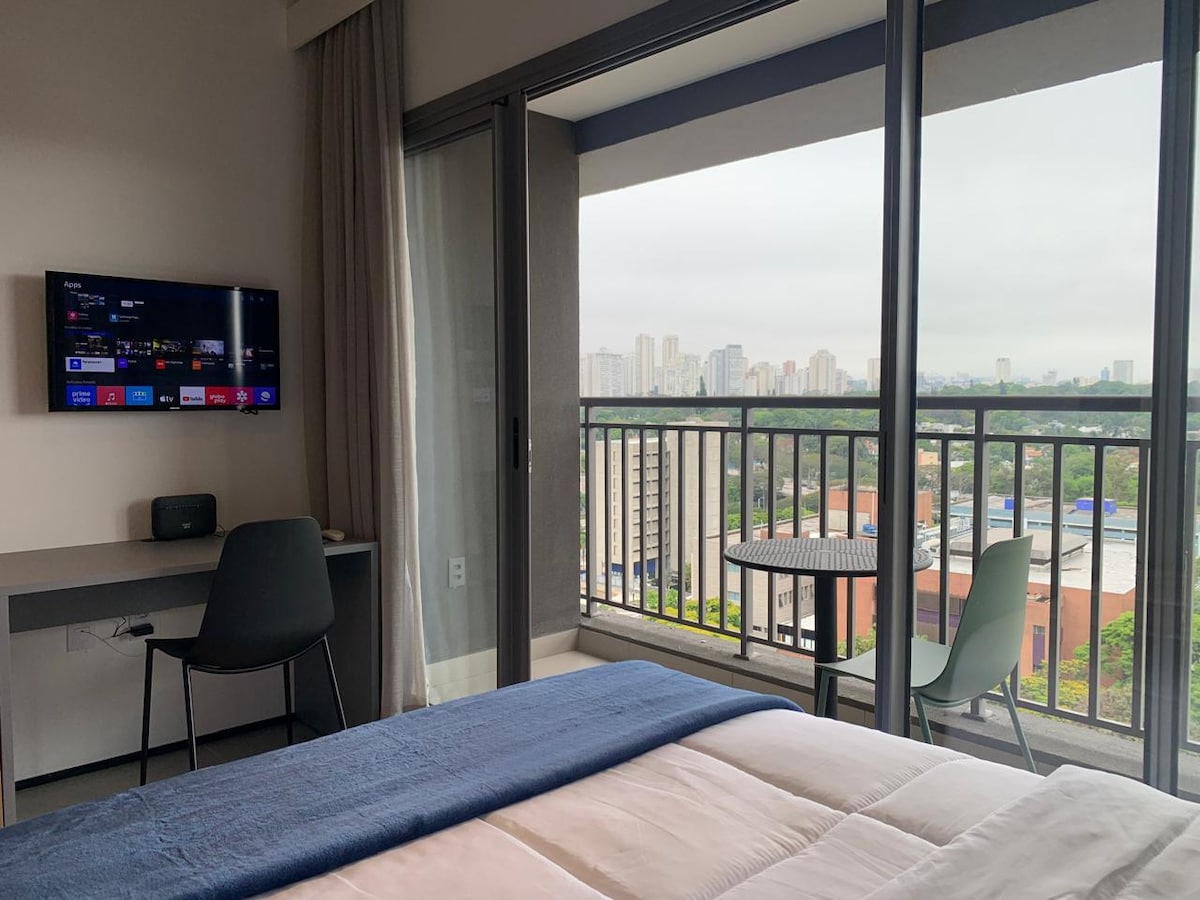 Studio equipado com vista (34m2 - 18º andar). Apto está ao lado da estação Brooklin do metrô, e 12 minutos de carro até o Aeroporto de Congonhas. . >> Locais próximos: . Hípica Paulista . Clínica Einstein . Consulado Americano >> Shopping centers próximos: . Shopping Morumbi . Shopping D&D . Shopping Ibirapuera . Shopping JK Iguatemi >> Você terá no condomínio: . Portaria 24h; . Academia; . Lavanderia OMO; . Coworking;
