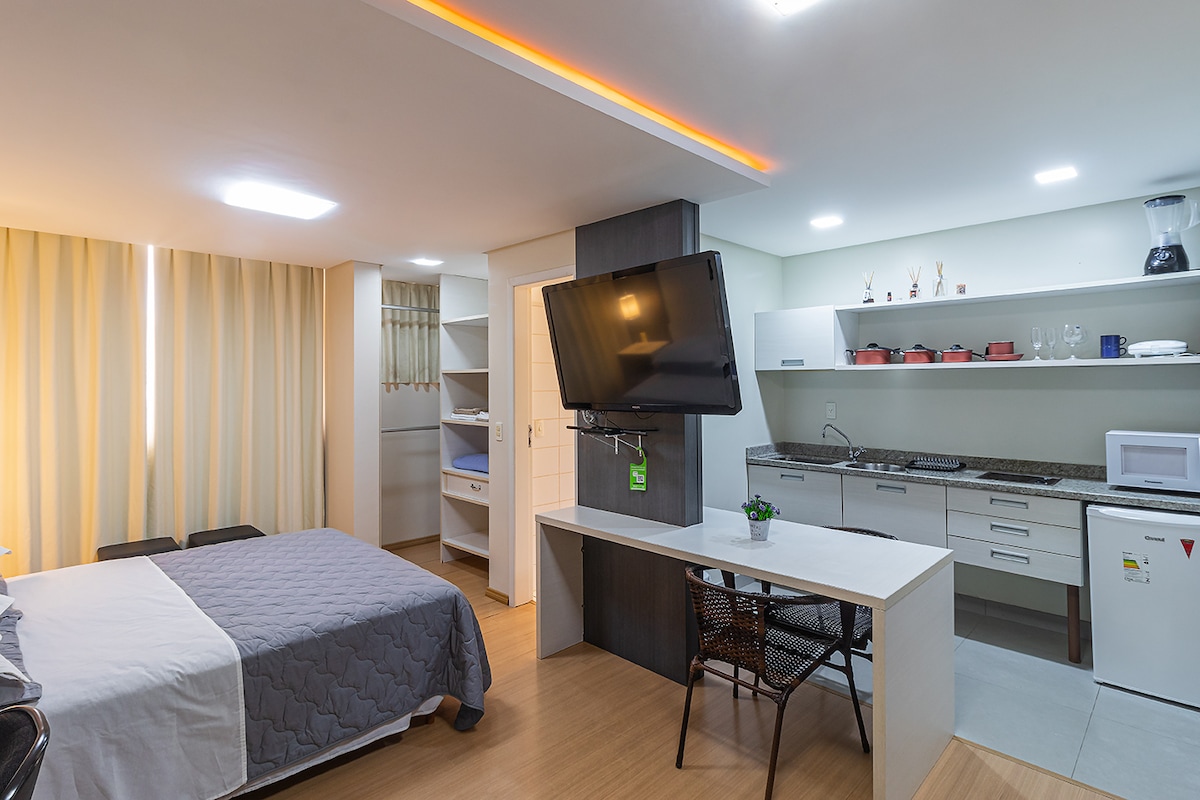 센터에 위치한 현대적인 스튜디오로, FURB 옆에 있으며 빌라 제르마니카에서 5분 거리에 있습니다. 와이파이, 에어컨, 스마트 TV, 주방 시설 완비치. 옥상 수영장(인피니티 에지), 헬스장, 공동 작업 라운지, 식료품점, 셀프 서비스 세탁기가 있는 건물입니다. 주차 공간이 없습니다. 건물 앞과 옆에 유료 주차장이 있습니다. • 전기차 충전기: 평일 영업시간에 사전 등록을 통해 콘도미니엄을 이용할 수 있으며, 이용 가능 여부는 상황에 따라 달라질 수 있습니다.