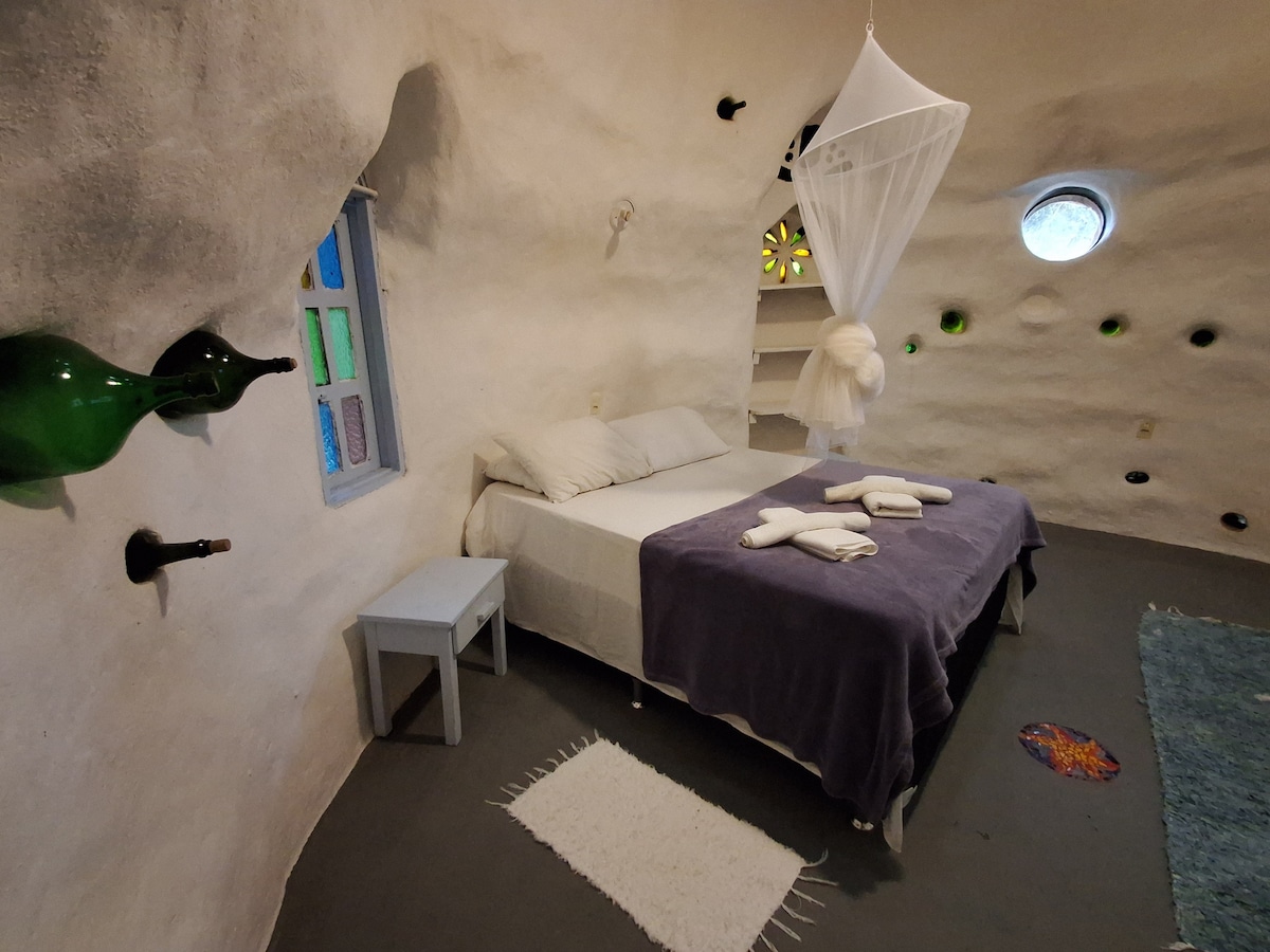 Esta acomodação é construída em Hiperadobe (terra ensacada), com paredes de 40 cm de espessura, e pintada com caolin (parte branca) e terra de falésia (parte marrom). A sensação térmica e o isolamento acústico são únicos. A acomodação conta com um studio, com sala e cozinha integrada, totalmente equipada, e um mezanino para o quarto. Há ar-condicionado, um sofá bicama (estúdio) e uma cama Queen (quarto). A área externa tem um amplo jardim com chuveiro e fogueira.