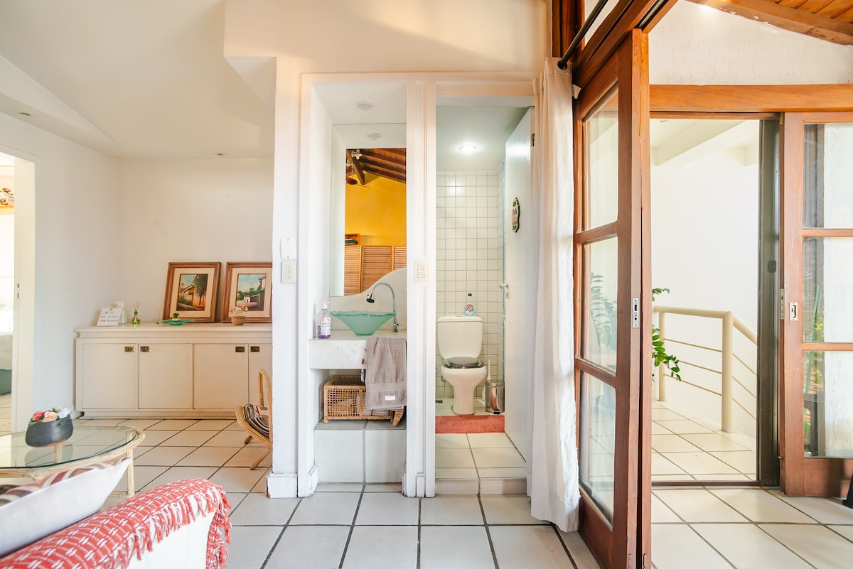 시골 같은 분위기의 산타 테레사 지역에 위치한 이 아파트는 테레사, 2 층에 1000m²의 녹지대에 위치한 2 개의 완전히 독립적인 유닛이 정원과 수영장을 공유하고 있습니다: 이 아파트와 스튜디오 (다른 광고). 그리스도상(코르코바도)과 산, 삼바드로모(카니발 퍼레이드)의 전망을 자랑하며, 오래된 교회 바로 앞에 위치하고 있으며 옆에는 가족 놀이터와 비스트로가 있습니다. 식민지 시대의 저택에 위치하고 있으며 별도의 출입구가 있습니다. 위층에는 주인이 거주하고 있으며 언제든지 도움을 받을 수 있습니다.