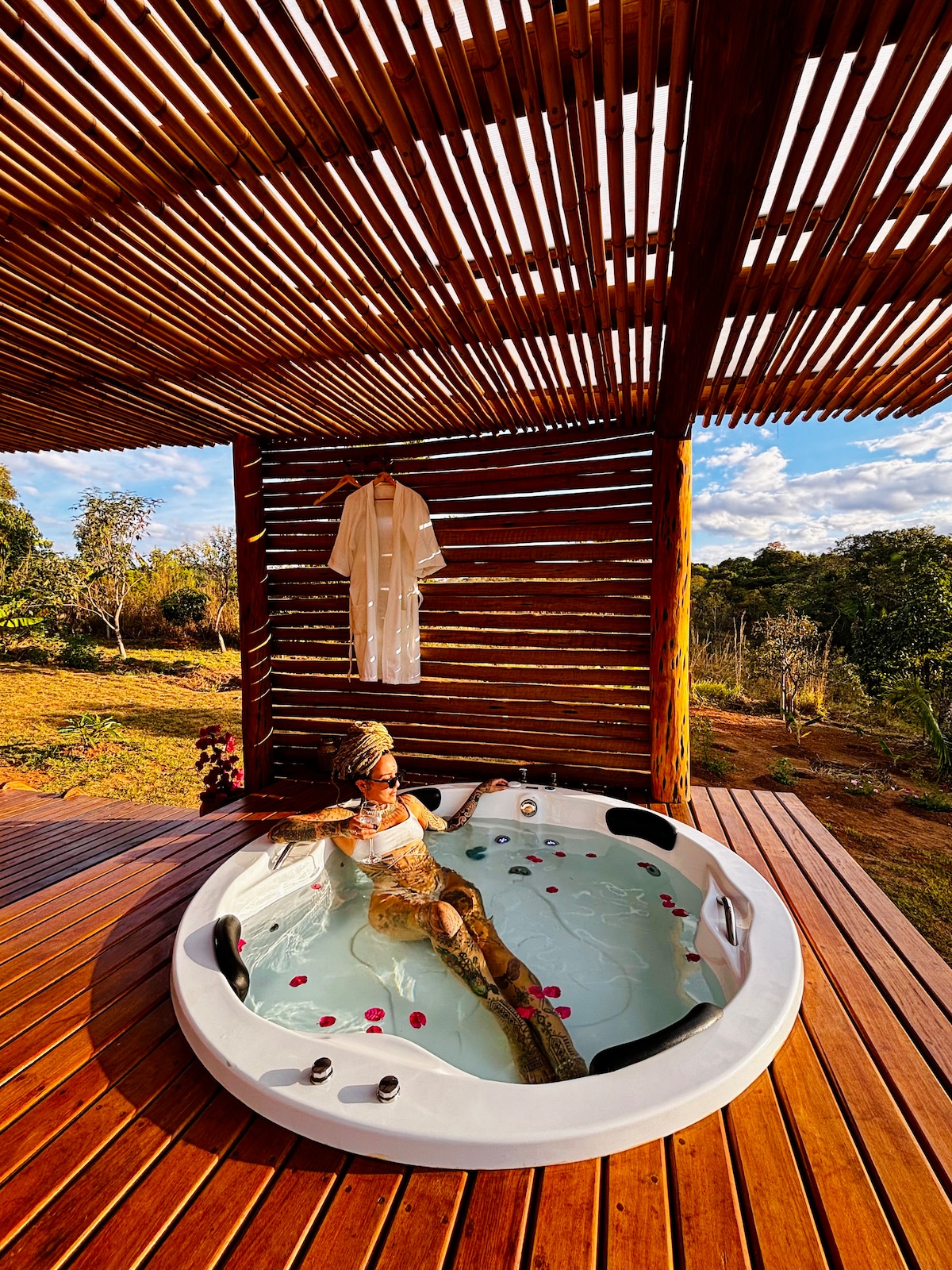 Com uma maravilhosa vista do vale e das montanhas e uma area para contemplação com banheira de hidromassagem privativa e piscina compartilhada, a Cabana Pouso Alto foi inspirada na arquitetura típica da região da Chapada dos Veadeiros. Construída com paredes de tijolos ecológicos de adobe, estrutura de eucalipto de reflorestamento e piso de cimento queimado, ela proporciona a seus visitantes a verdadeira experiência de viver e sentir a vida como ela é em meio ao cerrado. Piscina compartilhada