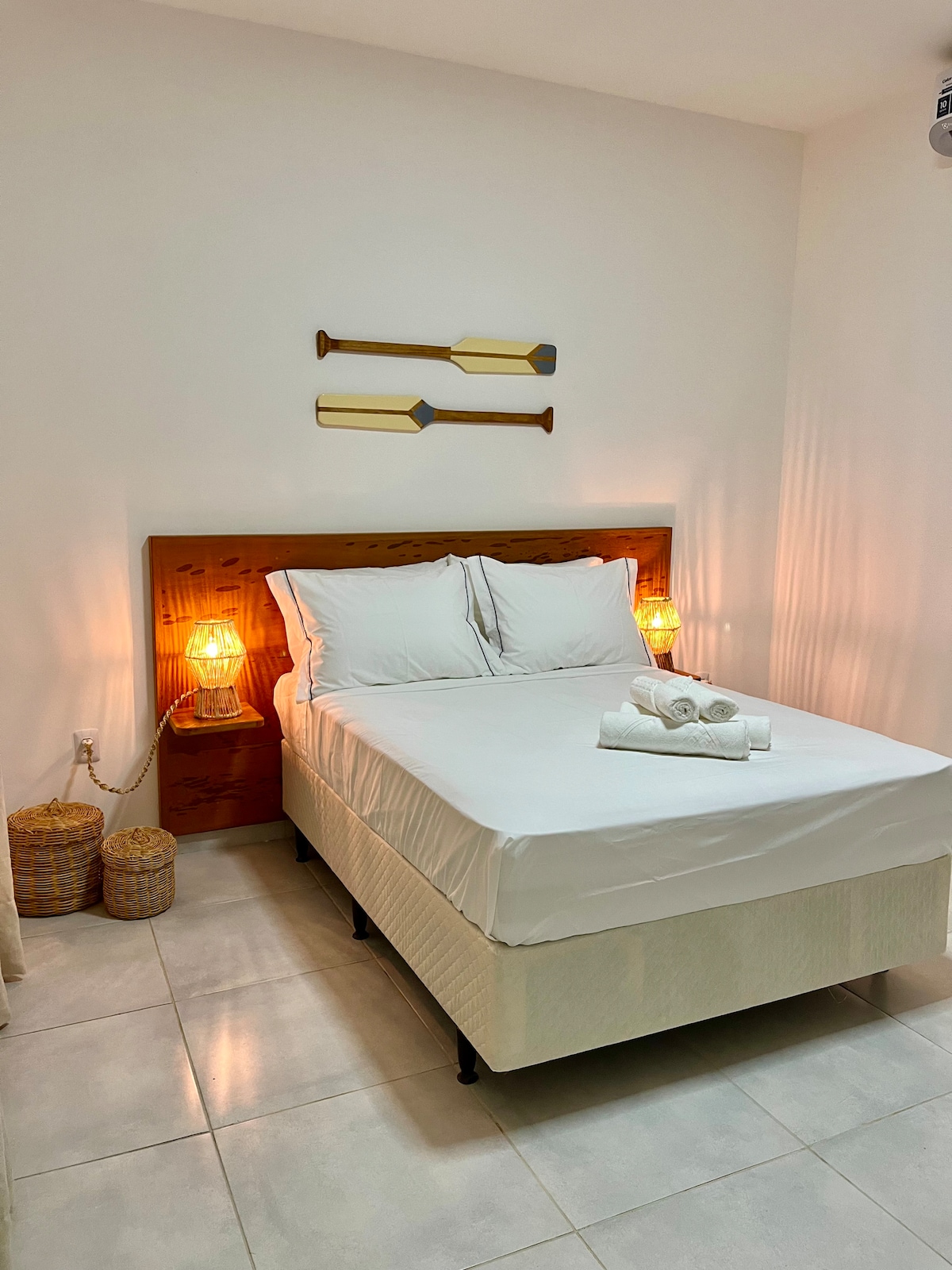 Chalés Mar e Sol oferece uma hospedagem aconchegante e bem equipada, projetada para proporcionar máximo conforto e praticidade aos seus hóspedes. Este espaço charmoso conta com uma ampla cama king size e uma cama de solteiro, ambas equipadas com roupas de cama completas de alta qualidade, garantindo uma noite de sono tranquila e revigorante.