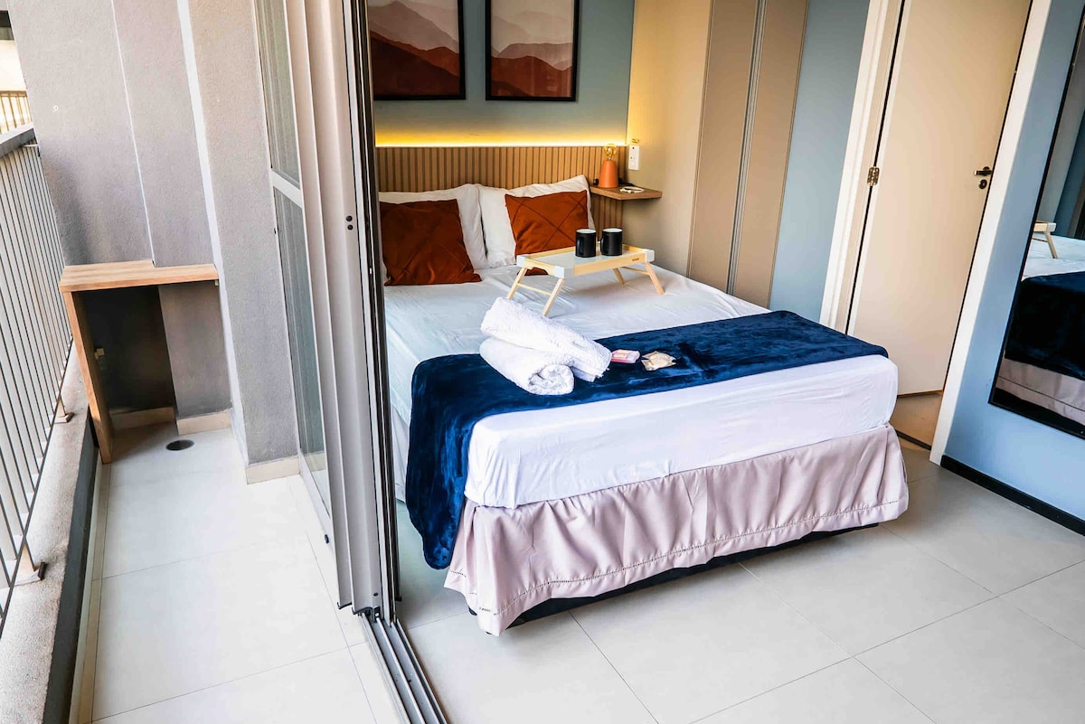 주의: 주차 시설을 사용하려면 사전에 알려야 합니다. 사진에서 숙소 입구를 참조하십시오. 아름다운 상파울루의 도시 전망을 자랑하는 멋지게 꾸며진 현대적인 로프트. 10cm 필로우탑이 있는 퀸사이즈 침대, 50인치 TV, 햇빛이 가득한 환경을 제공합니다. 주방에는 고급 조리 도구가 갖추어져 있으며 식탁과 조리대가 포함되어 있습니다. 옷장은 수납 공간이 넉넉하고 아파트에는 연중 편안함을 위한 에어컨이 설치되어 있습니다.