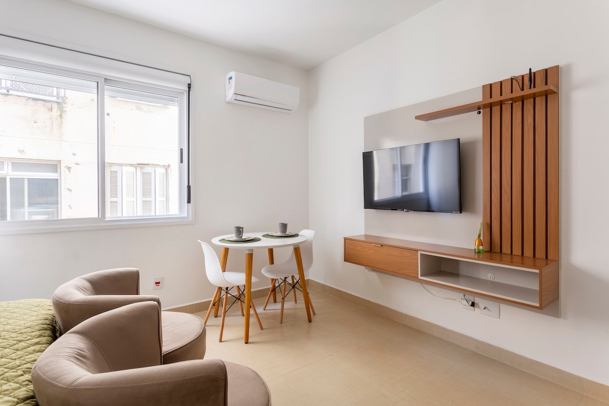 멋진 로프트로 꾸며져 있고 시설이 완비되어 있으며 최대 3명까지 편안하게 숙박할 수 있습니다. POA 시내의 훌륭한 위치, 회의실, 코워킹, 주방, 거실 공간, 그릴이 있는 옥상 (공용 공간) 이 있는 콜리빙 건물. 고층에 위치한 아파트로 매우 아늑하고 시설이 완비되어 있습니다. 매우 편안한 퀸사이즈 침대, 소파 베드, 침대 및 욕실 용품, 주방, 에어컨, 스마트TV 및 와이파이.
