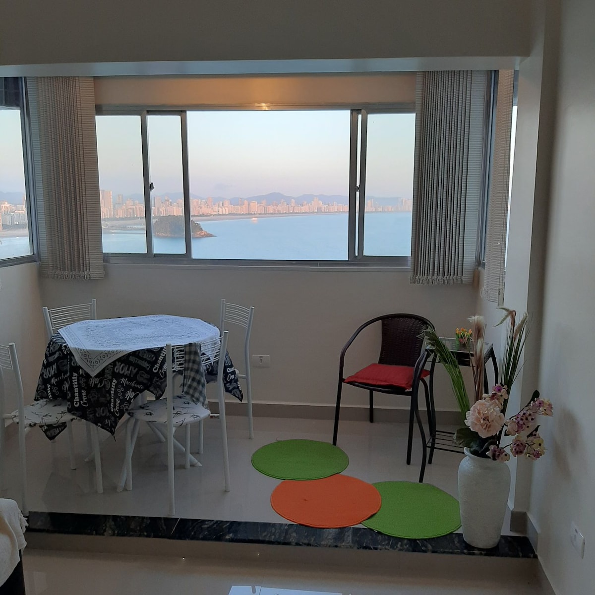 Um cantinho especial, super aconchegante para aproveitar a dois... ou mais pessoas. Confortável e leveza no 12o. andar. Silencioso, vista panorâmica do mar, das praias de São Vicente, Santos e até do Guarujá. Janelas grandes, vc poderá apreciar o sol nascer sobre o mar no horizonte... e o céu estrelado deitando na cama ao barulho do mar... A vista é realmente incrível! Um lugar de PAZ para se desligar do stress!!