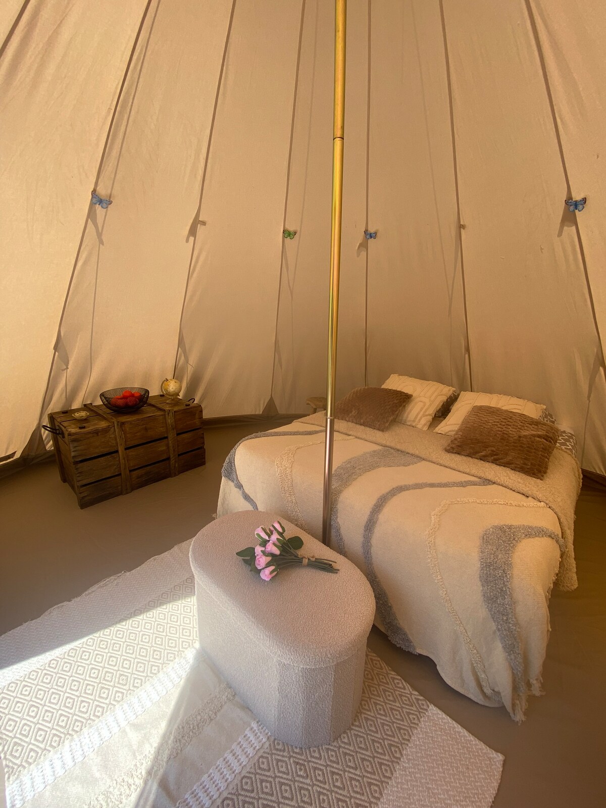 Sur une grande parcelle pour plus d'intimité, une tente de 20 M2 décorée dans un esprit zen et romantique. Jacuzzi privatif sur votre terrasse. Pour une expérience inoubliable, un braséro face au paysage champêtre pour faire griller des chamallows ( offerts) et vivre un moment romantique devant un feu sous les étoiles. Toilettes sèches sur emplacement. Salle d'eau privative à 40 mètres de la tente. Frigo avec soft drink offert. Petit déjeuner, linge de lit et de toilette, ménage sont compris