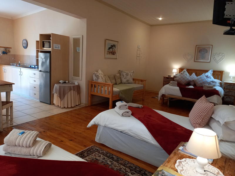 퀸사이즈 침대, 식탁+의자, 샤워기가 있는 욕실이 있는 넓은 객실. 간이 주방 (냉장고, 전자레인지, 2구 가스레인지, 주전자, 주전자, 토스터, 세면대, 세면대, 냄비, 냄비, 프라이팬, 식기), DSTV. 에어컨. 도로를 마주하고 있습니다. GH 뒤편에 주차장과 브라이, 와이파이가 있습니다.