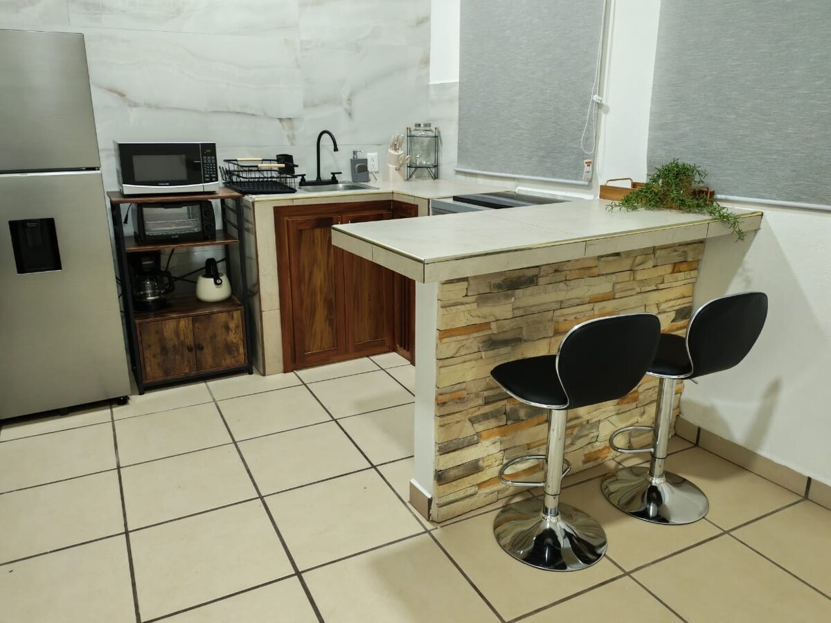 우수한 위치에 있는 이 숙소를 즐겨보세요. Boulevard Tepic-Xalisco에서 몇 블록 거리에 있으며, UAN, 병원, 파르케 라 로마 근처에 있습니다. (4분🚗) 🌳 무료 넷플릭스 및 프라임비디오 🤩 🍿 🎥 퀸사이즈 침대, 에어컨❄️, 업무용 책상, 소파 베드, 식사 공간, 필요한 모든 기구가 구비된 주방이 있는 1베드룸 아파트