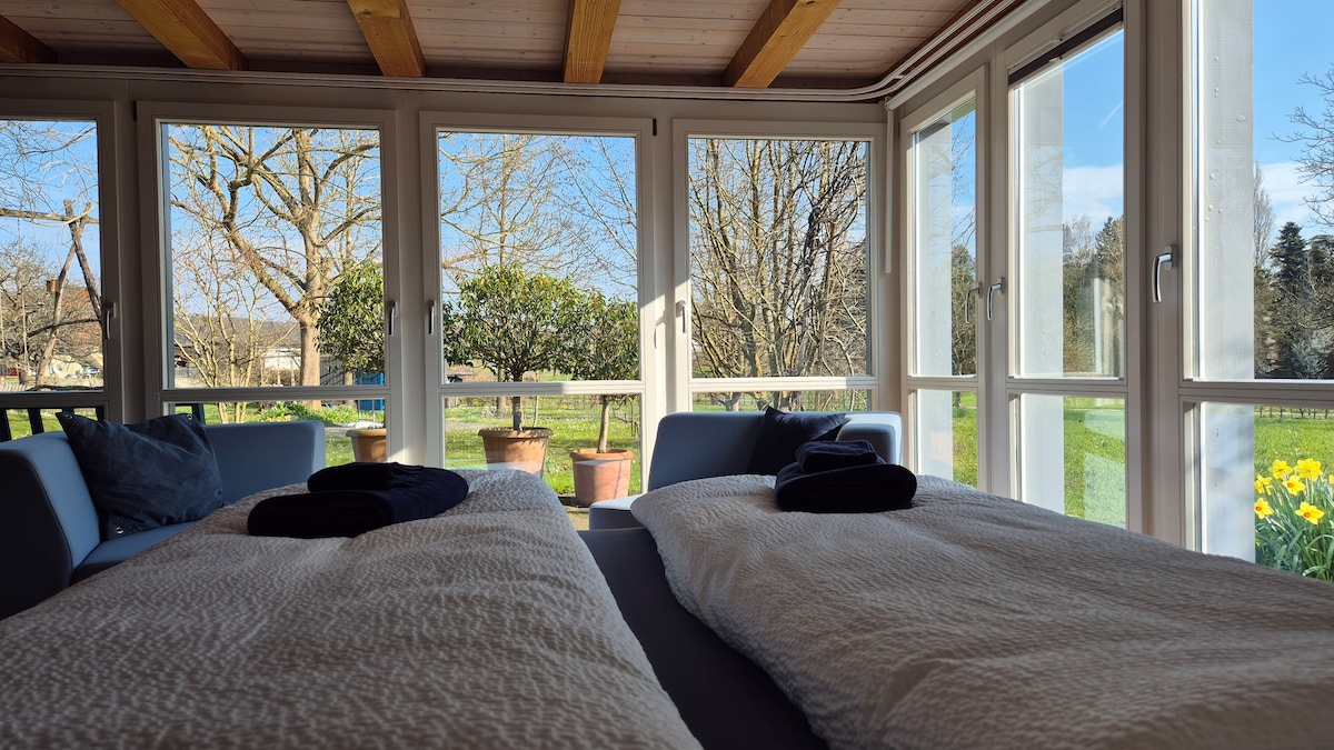 게스트에게 전용 아파트가 제공되지만, 한 그룹에게만 임대됩니다. 더블베드2개와 싱글베드가 있어서 요청 시 유아용 침대 이용 가능. 이 아파트는 2층에 있으며 계단(엘리베이터 없음)을 통해 접근할 수 있지만 매우 조용하고 무노트, 라인, 샤프하우젠의 멋진 전망을 자랑합니다. 샤프하우젠 시내까지 도보로 10분이면 도착할 수 있습니다. 차를 주차할 수 있는 주차장이 제공됩니다. 방해받지 않는 일광욕을 즐길 수 있는 대형 옥상 테라스.