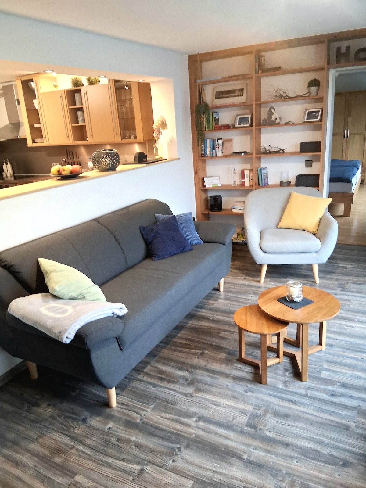 Voll ausgestattetes, ebenerdiges großzügiges Apartment (120 qm) auf Resthof (Alleinlage). 40+ qm amerikanische Wohnküche, 2 Schlafzimmer, Ankleide, Badezimmer mit Wanne und Dusche, Kamin, Sat-TV, Internet-WLAN. Duschbad am Schlafzimmer, Terrasse, Gartennutzung, uvm.