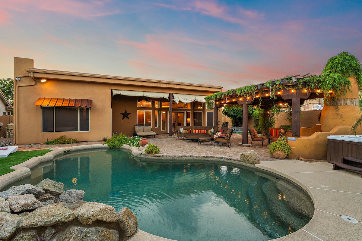 스카이 하버 국제공항에서 15분, 스코츠데일 엔터테인먼트 지구에서 5분 이내 거리에 있어 편리함과 고급스러움을 모두 즐길 수 있습니다. 침실 4개, 욕실 3개, 2,100평방피트의 넓은 개방형 바닥 구조를 자랑합니다. 각 침실에는 스마트 TV, 우아한 침구, 푹신한 매트리스가 갖춰져 있습니다. 거실의 탁구대에서부터 패밀리룸의 85인치 LED TV에 이르기까지 엔터테인먼트 옵션이 풍부합니다. 외부에서는 6인용 온수 욕조, 수영장, 화덕, 라운지 공간을 완전히 둘러싸인 뒷마당에서 즐기실 수 있습니다.