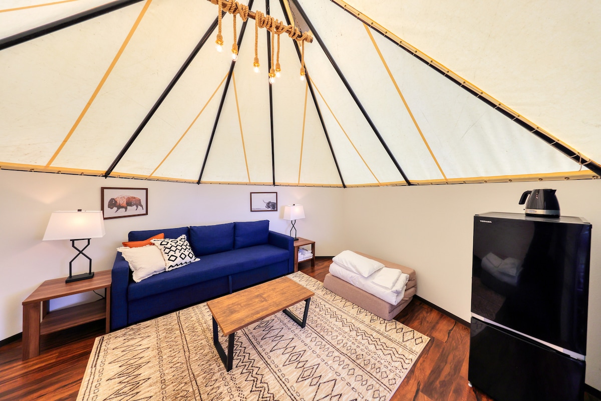 【Limited to 5 couples per day!Glamping style facility】 Stylish sofas, open-air baths, and spacious decks are perfect for those who want to enjoy their own private space. Visitors can enjoy outdoor experiences such as lodging in large tents and cottages, outdoor BBQ, and bonfires. The facility's outdoor pool is open to all guests. Pets are allowed in this facility. (In the event of stains or damage, a repair fee will be charged.)