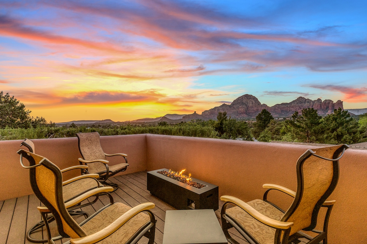 This mountain-top getaway offers magnificent red rock views from every patio and window, as it is built into the side of the famous Airport Mesa. It can accommodate a family or group of up to seven but is also perfectly suited for a couple's vacation. DIRECT BACKYARD ACCESS to the National Forest, leading you to the Airport Mesa trail system. This is one of Sedona’s most beautiful and sought-after areas.
