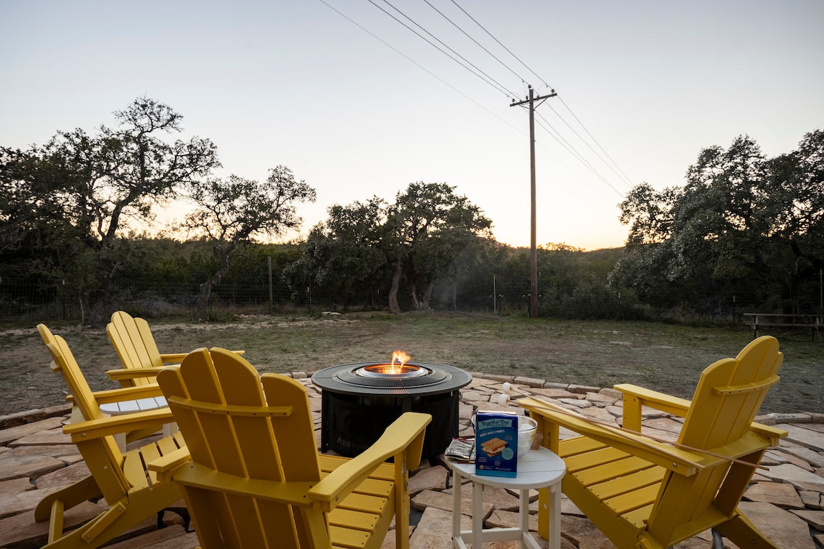 Welcome to TheโฏNest, a cozy hideaway at WanderinโโฏStarโฏFarms. The Nest was created in response to our guests loving the original! The upper deck has chairs with a propane fire pit, propane grill, and dining table. Hill country vibe 'soaking trough' on lower deck. Inside is a King Bed looking out the skylight, full bathroom with tub, coffee bar, kitchenette, Roku TV, wifi, & work table.