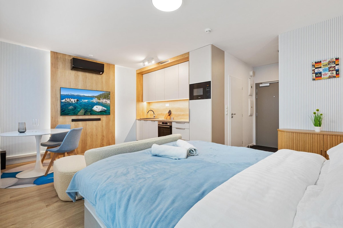 Brand-new, modern and bright apartment in a quiet residential area near the airport. Enjoy panoramic views of Bratislava Castle and the Kamzík TV Tower. The flat is spacious, fully equipped (kitchen, bathroom, AC, TV, Netflix, WiFi) and perfectly soundproof. Bistro is in the building, groceries and café 1 min away. Great connections to the center, mall and station. Located in a new building in a calm, safe and fully family-friendly area. Parking included. Your perfect home in Bratislava.