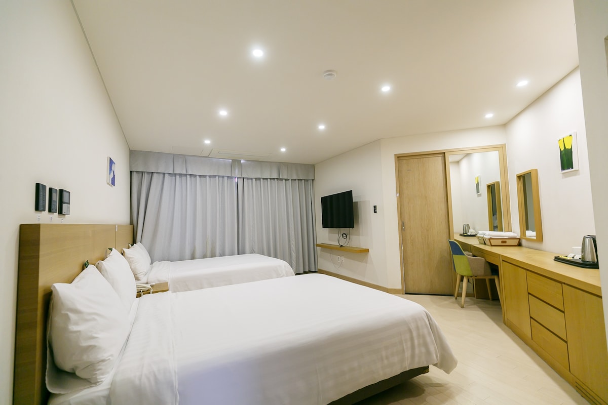 ์ด 55๊ฐ์ ๊ฐ์ค์ด ์๋ 7์ธต ๊ฑด๋ฌผ์ ๋๋ค. ๊ฐ์ค๋ด์ ์์กฐ ๋ฐ ๋ฒ ๋๋ค๊ฐ ์์ต๋๋ค. ๊ฐ์ค์์ ๋ฌด๋ฃ WIFI ์ฌ์ฉ์ด ๊ฐ๋ฅํ๋ฉฐ, TV์ ๋์ฅ๊ณ , ์ปคํผํฌํธ ๋ฑ์ด ๊ตฌ๋น๋์ด ์์ต๋๋ค. ์นจ๋๋ ๋๋ธ๋ฒ ๋ 2๊ฐ๋ก 4์ธ๊น์ง ํธ์ํ๊ฒ ์ฃผ๋ฌด์ค ์ ์์ต๋๋ค. 5์ธ ์๋ฐ์์ ์นจ๊ตฌ์ถ๊ฐ(1๋ฐ 1๋ง์ ๋ณ๋)๋ฅผ ํ์๋ฉด ๋ณด๋ค ํธ์ํ ์๋ฐ์ด ๊ฐ๋ฅํฉ๋๋ค. ์ ์ฃผ๊ณตํญ์์ 600๋ฒ ๋ฆฌ๋ฌด์ง ๋ฒ์ค ์ด์ฉํ์ฌ ์๊ทํฌํญ์ ๋ด๋ฆฌ์๋ฉด ๋๋ณด 3๋ถ ๊ฑฐ๋ฆฌ์ ํธํ ์ด ์์นํ๊ณ ์์ต๋๋ค. ์๊ทํฌํญ์์ ๊ฐ๊น์ด ์์น์ด๋ฉฐ, ๊ทผ์ฒ์ ์ฒ์ง์ฐ ํญํฌ์ ์์ฐ๊ต์ ์์ฌ์ด ๊ฐ๊น์ด ์์ผ๋ฉฐ, ์ด์ค์ญ ๋ฏธ์ ๊ด๊ณผ ์ฌ๋ ์์ฅ๋ ๋๋ณด ์ด๋ ๊ฐ๋ฅํ ๊ฑฐ๋ฆฌ์ ์์นํ๊ณ ์์ต๋๋ค. ํธํ 1์ธต์ ๊ณต์ฉ์ธํ์ค์ด ์์ผ๋ฉฐ, ํธํ ์์ 100m ๊ฑฐ๋ฆฌ์ 24์๊ฐ ๋นจ๋๋ฐฉ์ด ์์ต๋๋ค. ํธํ ์กฐ์์ 1์ธ 1๋ง์ ์ ๋๋ค. ์ฒดํฌ์ธ์ ์ฌ์ ๊ฒฐ์ ๋ฅผ ํ์๋ฉด 50% ํ ์ธ๋ 1์ธ 5,000์์ ํธํ ์กฐ์์ ์ด์ฉํ์ค ์ ์์ต๋๋ค. ํธํ 1์ธต์ CUํธ์์ ์ด ์์ต๋๋ค.