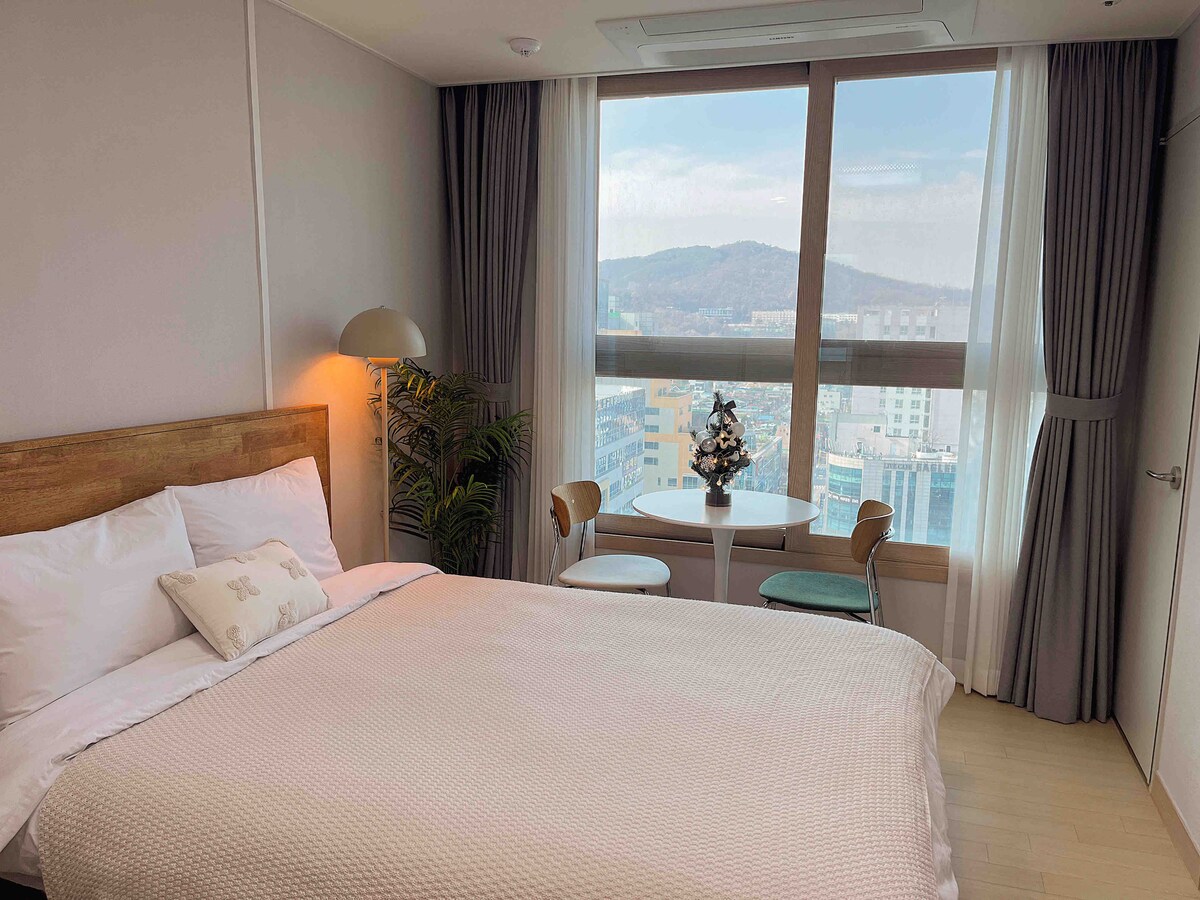 2023년 오픈 냉장고, 세탁기, 주방, 옷장, 에어컨이 풀옵션으로 갖춰진 레지던스 입니다. - 언택트 체크인 숙소 [침실] - 퀸 사이즈 베드 1개 [주방] - 간편한 취사가 가능한 각종 조리도구 - 냉장고, 전자레인지, 커피포트 - 세탁기, 세탁세제 *조미료는 구비되어 있지 않습니다. [욕실] - 샴푸, 컨디셔너, 바디워시 - 헤어드라이기, 수건 - 객실에 구비된 비데 * 1회용 욕실용품(칫솔, 치약, 폼클렌징 등) 제공은 불가합니다. * 55" Smart TV 넷플릭스(개인계정)/유튜브 시청 가능합니다. * 건물내 유료 주차 가능 합니다.