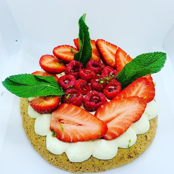 이국적인 과일이 들어간 파블로바 또는 생일 케이크.