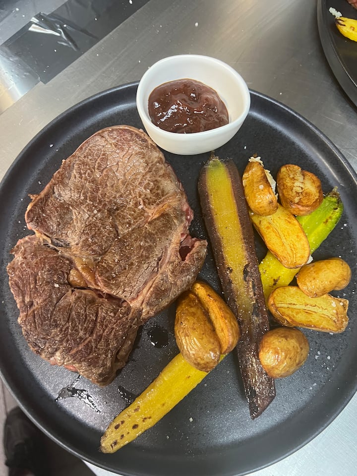 송로버섯, 쥐스 코트, 제철 야채를 곁들인 송아지 스테이크.