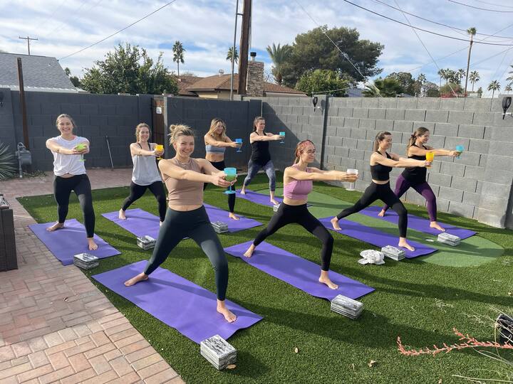 이것은 가장 큰 그룹 가격입니다. 미리 알려주시면 매트와 모든 장비를 준비할 수 있습니다. 게스트의 필요에 맞게 맞춤화되었으며, 사바사나를 위한 차가운 라벤더 천도 제공합니다. 파워 요가부터 바레, 요가, 인, 아쿠아 퓨전까지 모든 유형의 수업을 제공할 수 있습니다.