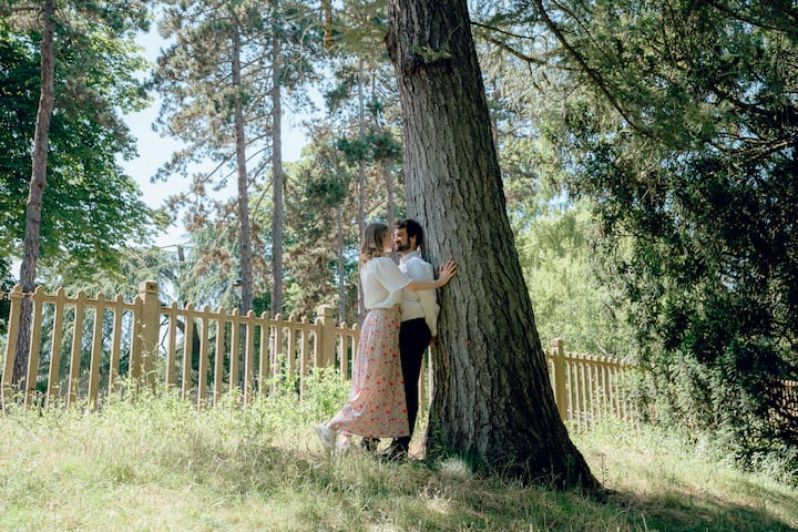파리의 대형 공원에서 자연스럽고 감성적이며 영화적인 커플 초상화를 부드럽게 안내합니다.