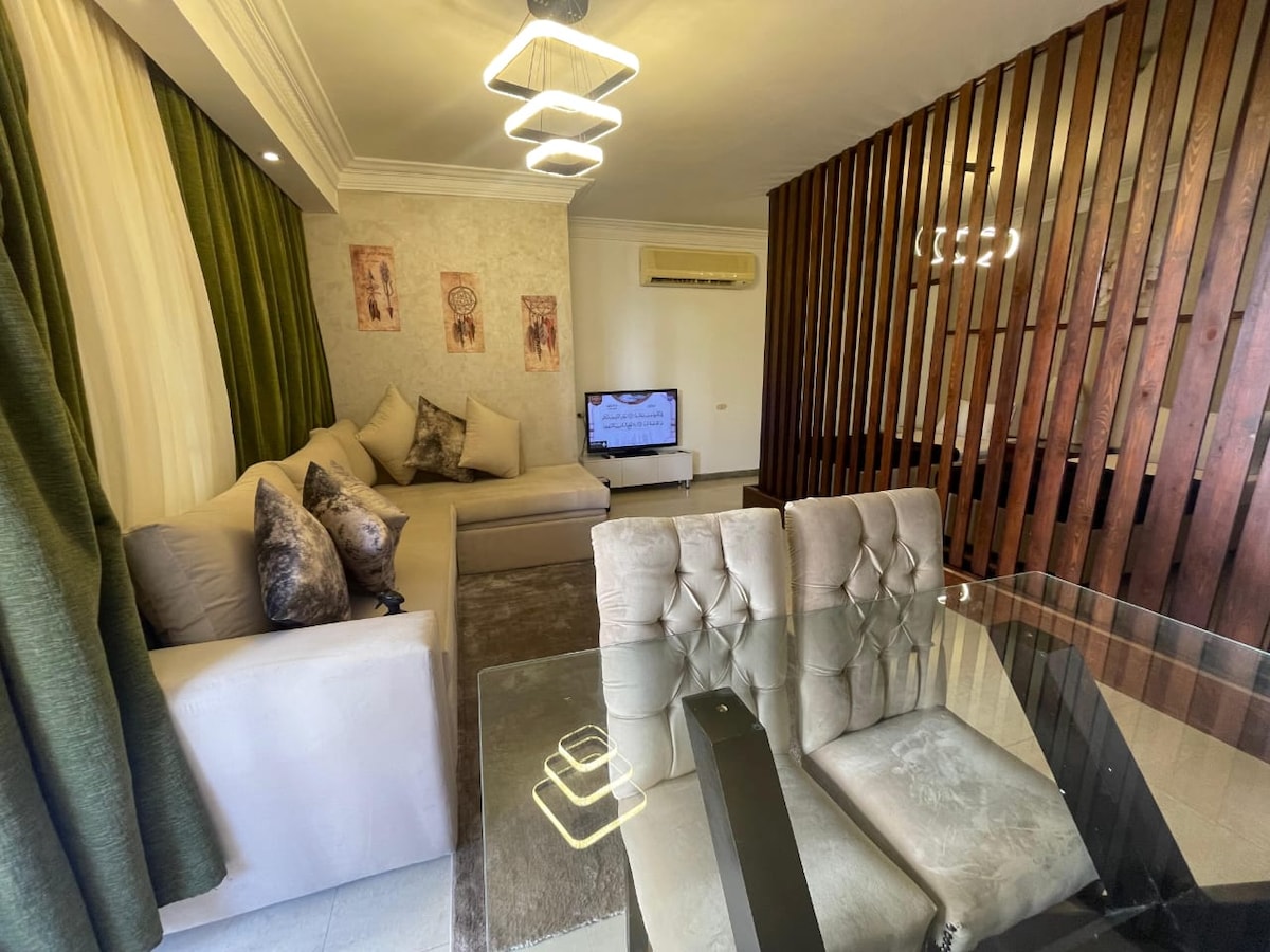 Kick back and relax in this calm, stylish space. Brand-new luxury apartment in peaceful Montazah with premium renovation and modern design. Ground floor with direct terrace to shared pool-step out for a swim!Great pool views. Rooftop pool with panoramic Red Sea views 5-min walk to beach 5-min drive to SOHO Square (restaurants,bars,shopping,shows 70 m²:1 bedroom(sleeps 2),open living+full kitchen (new appliances+washer Fast Wi-Fi,Smart TV, AC,free parking,secure complex. + Sharm Guide❤️