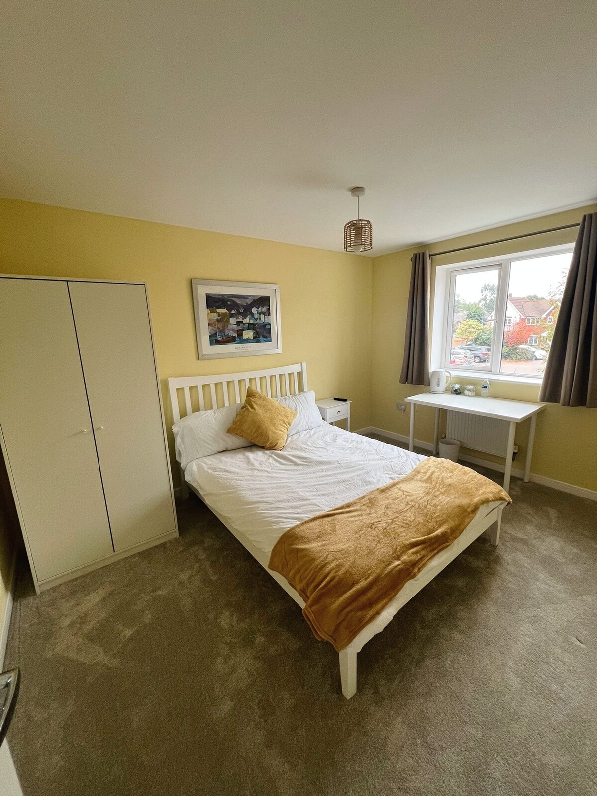 Small private annexe nr town centre. Free parking opposite side of road. On-site if booked. Kitchenette -microwave oven, kettle, coffee machine, fridge, freezer, sink. This is not a full kitchen. Compact shower room, small hand basin/w.c. Desk/breakfast bar power sockets. Kingsize bed. Easy walk to Rugby railway station Town-5 minute walk. Wifi/ Freeview Please ask for unlisted items if needed. Laundry next door- washing machine available from 08:00 until 19:00. Dryer/ hanging rail on request.