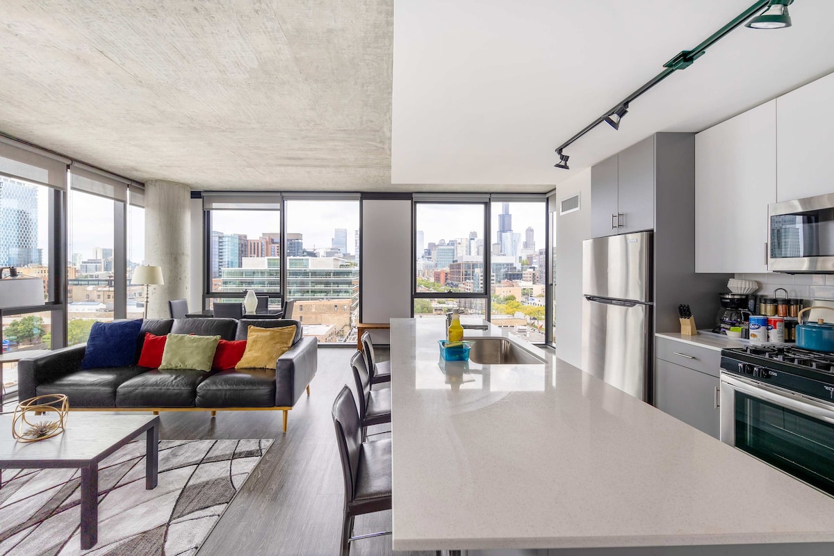 Welcome to your spacious urban getaway in Chicago’s Printer’s Row! - Modern 3-bedroom, 3-bathroom unit - Bright, open-concept living space with floor-to-ceiling windows - Fully equipped kitchen with stainless steel appliances - Access to rooftop pool and fitness center - Panoramic skyline views from the rooftop deck - Steps from cafes, restaurants, and parks - @TheDreamRentals