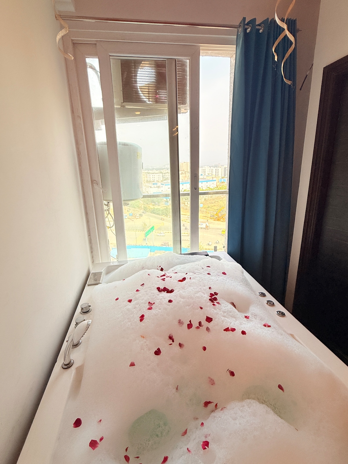보헤미안 스타일과 여유로운 고급스러움이 돋보이는 4베드 빌라입니다. 눈부신 수영장 주변을 안뜰 스타일로 배치한 숙소입니다. 칙칙한 분위기의 객실 3개에는 킹사이즈 침대가 있습니다. 한 객실에는 침대 2개가 있으며, 모든 객실에는 전용 욕실이 딸려 있습니다. 바이샬리 나가르의 활기찬 카페와 세련된 바에서 단 10분 거리에 있는 이 빌라는 75인치 스마트 TV, 보스 스피커, 실내/야외 바, 1200평방 피트의 거실 홀, 큐레이션된 주방을 자랑합니다. 연중무휴 하우스키핑, 선택 가능한 셰프 서비스, 원활한 조마토 및 블링킷 배달을 즐겨보세요.
