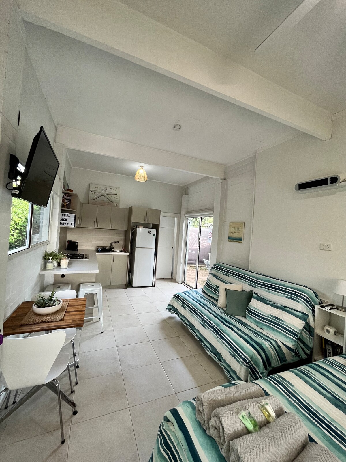 Spacious Beachside Studio – Private & Peaceful Relax in this beautiful, modern, self-contained studio just 150m from the beach. Fully detached for complete privacy, it’s the perfect mix of comfort and coastal charm. Enjoy a morning swim, beach walk or try our bikes, boogie boards, or paddle boards. After a day by the sea, unwind in your own private outdoor space with a BBQ, lounge and dining area, all set to the sound of the ocean. Your peaceful beach escape awaits!