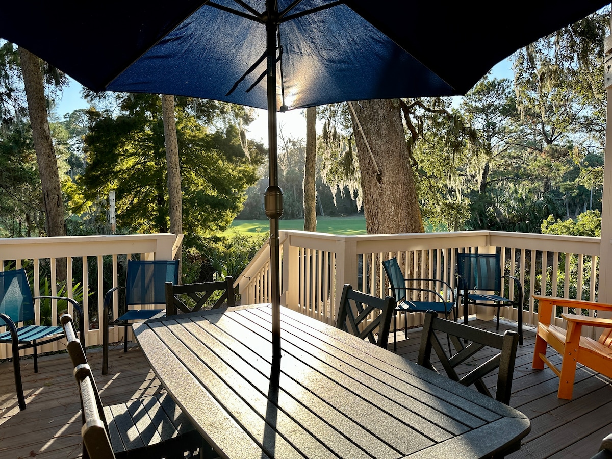 Gated Beach & Golf Resort! โจTop 5% Airbnb Guest Favoriteโจ Beach, Golf, Pool, Spa, Restaurants & Bars FREE Pickleball & Tennis โ across the street HGTV Decorator designed Panoramic Golf & Lagoon Views! Big Porch Lush Landscape Tons of Wildlife Coastal Dรฉcor Sunny 1st Floor End Unit KING BED + 2 QUEENS 3 XL SmartTVs FAST WIFI & CABLE Chef's Kitchen Washer/Dryer BBQ Beach Cart, Chairs, Boogie Boards, Ice Chest Walk/Bike/Drive to Beach Walk to Golf Club & Pub Close to Coligny Summer Beach Shuttle