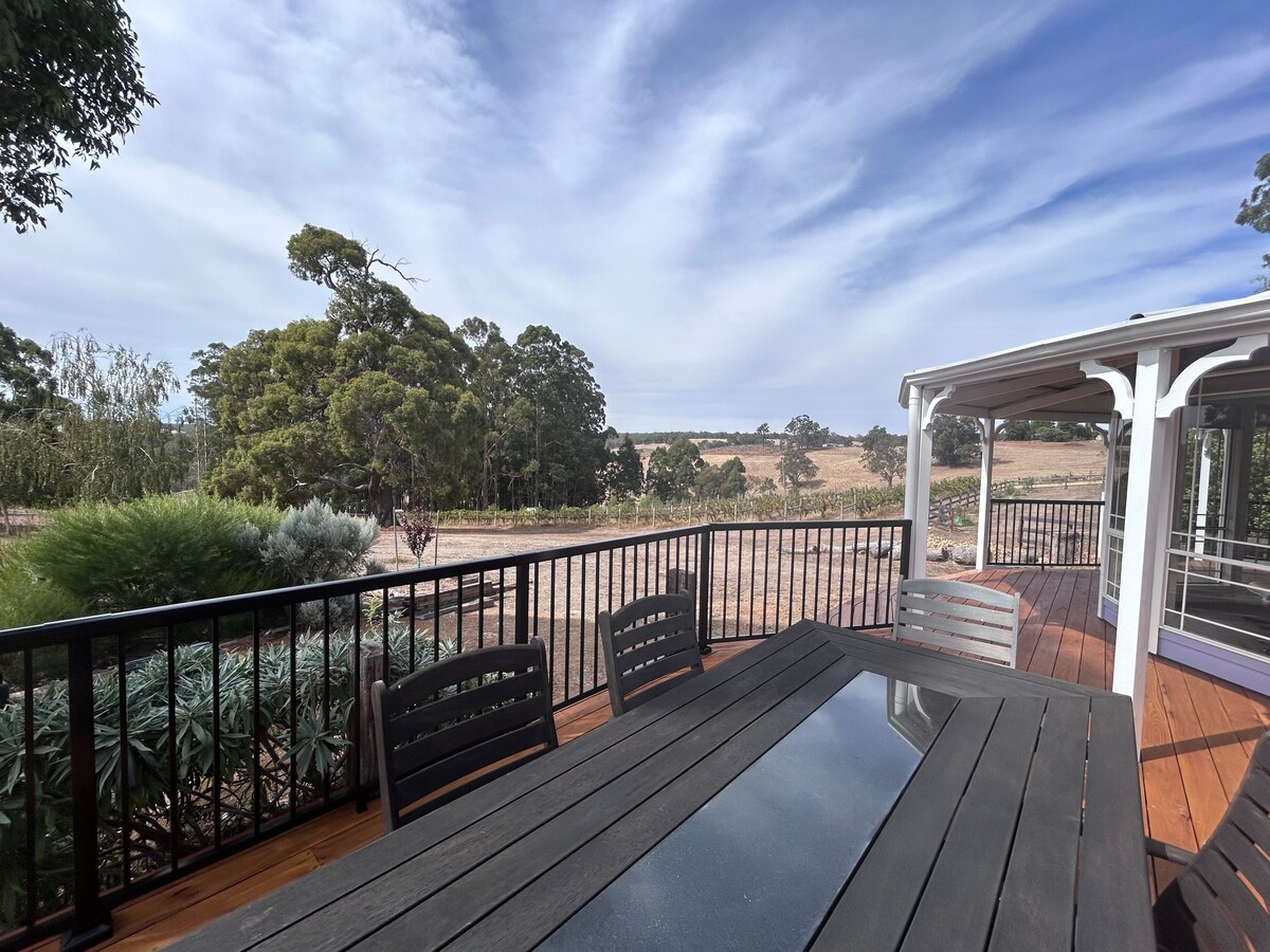 The American style barn house is discreetly nestled in the secluded tranquil grounds of Birdwood Park Estate, a small seventeen acre hobby farm bound by Balingup Brook on three sides and the Avenue of Honour on the fourth. Stunning views of the surrounding rolling hills and brook are complimented by the impressive oak trees. Despite the quiet rural ambience guests are only a very short stroll from the centre of the Balingup village.