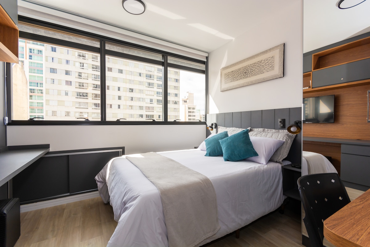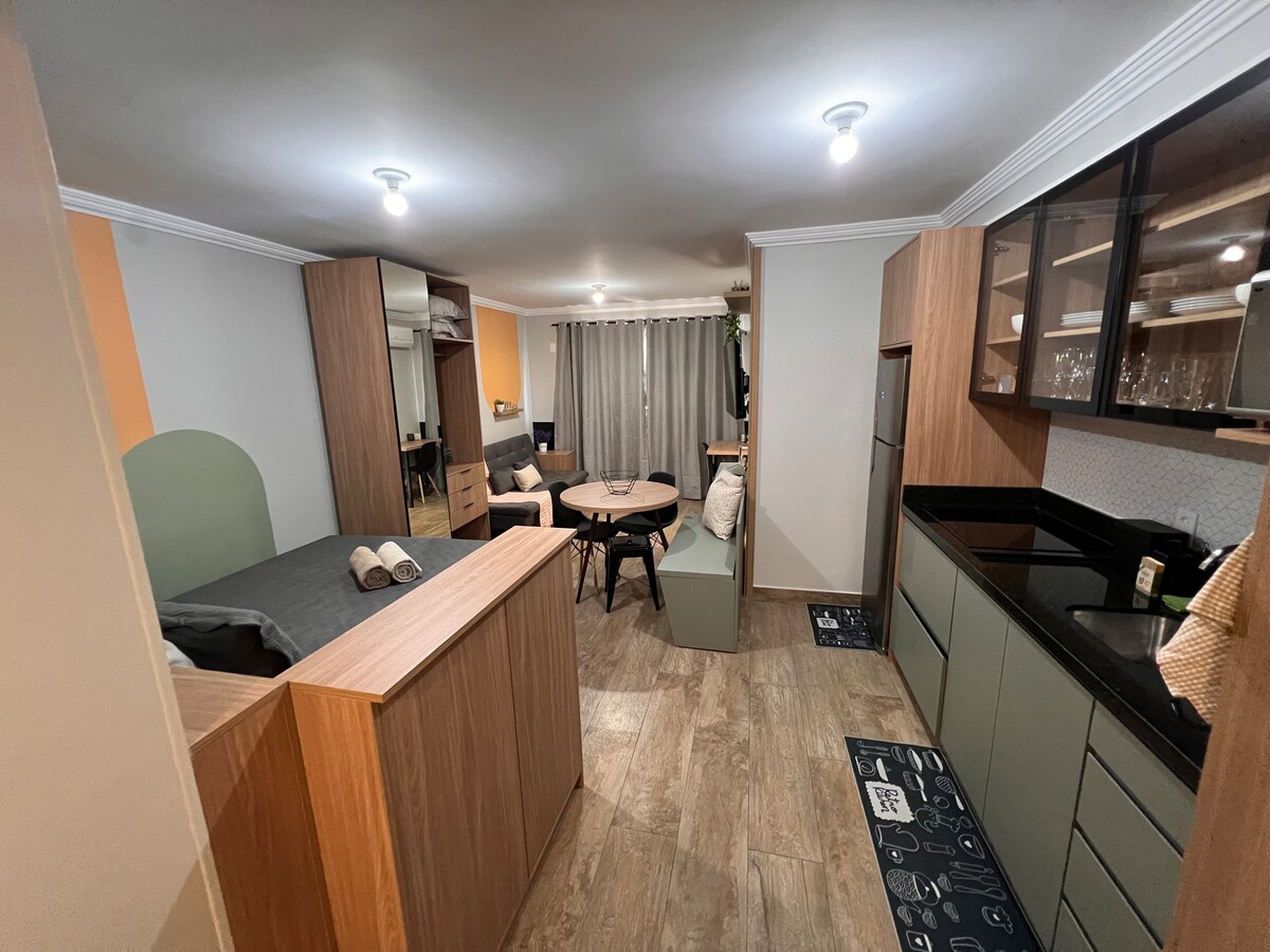 쿠리치바 중심부에 위치한 건축가들이 설계한 디자인 스튜디오. 현대적이고 현대적인 인테리어, 최고급 가전제품, 완벽한 마감재로 가구가 완비되어 있습니다. 더블 침대와 싱글 침대가 있어 최대 3명까지 수용할 수 있습니다. 완비된 주방, 초고속 와이파이, 스마트 TV, 에어컨. 출장이나 레저에 안성맞춤입니다. 모든 것에 가까운 중심부의 특권적인 위치. 독특하고 세련된 공간에서 최고의 호스팅을 즐겨보세요! 샤워기가 완벽해요😍