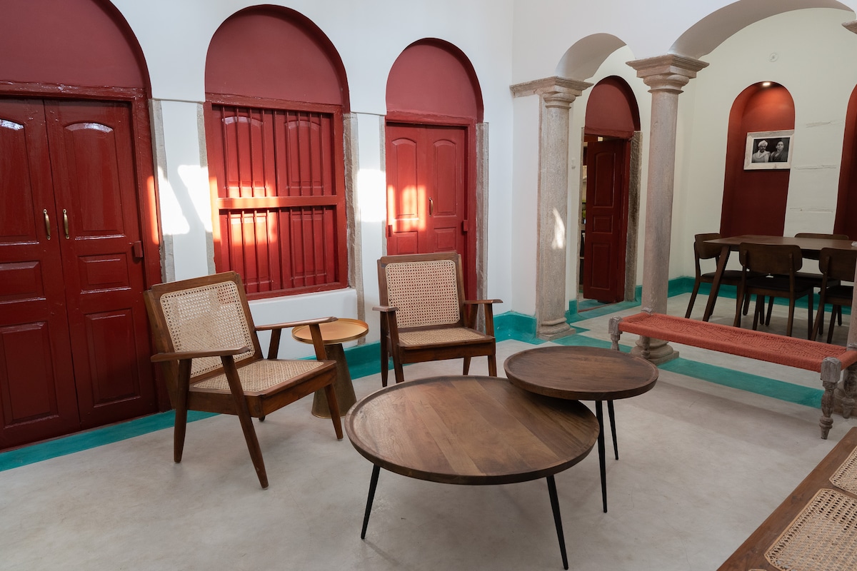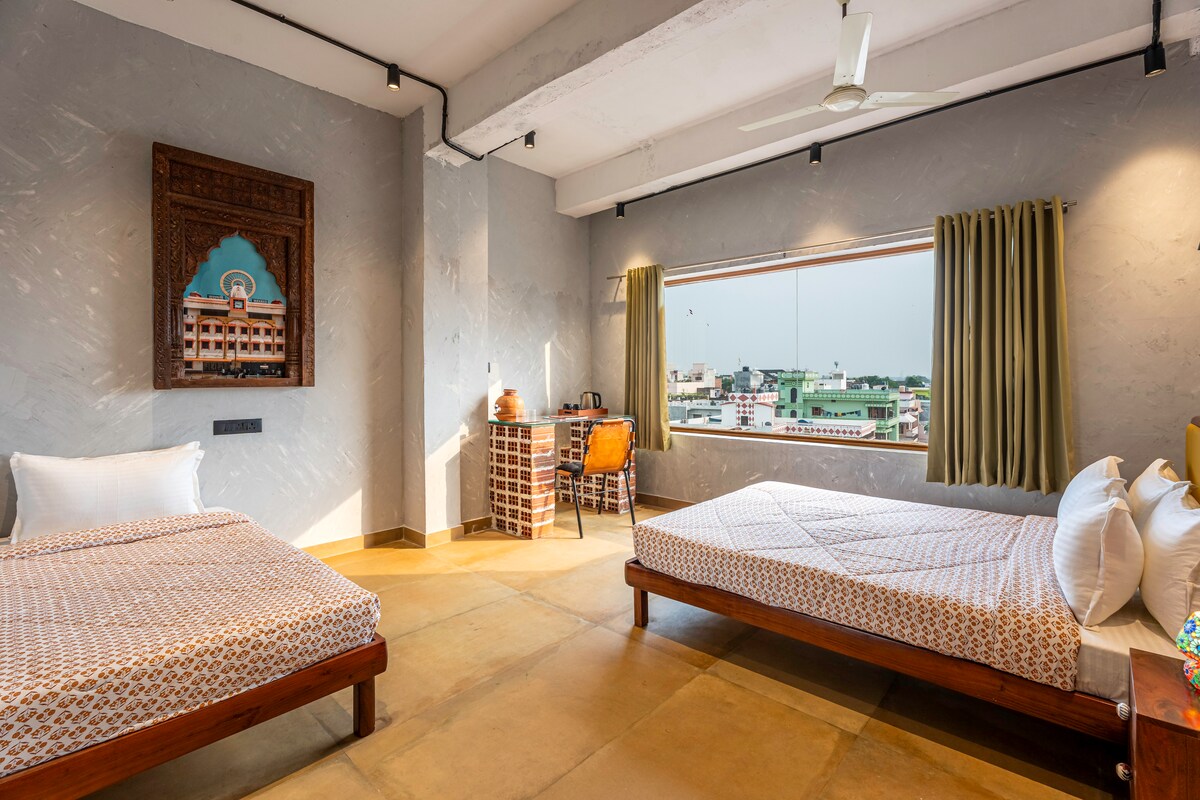 Serene Varanasi Luxury Homestay, a tranquil retreat in lush greenery. Featuring two interconnected bedrooms, this space comfortably fits families or small groups. Enjoy affordable luxury with a dedicated workspace, AC, and Wi-Fi. Perfect for families, remote workers, and spiritual seekers looking for a peaceful base in the holy city.