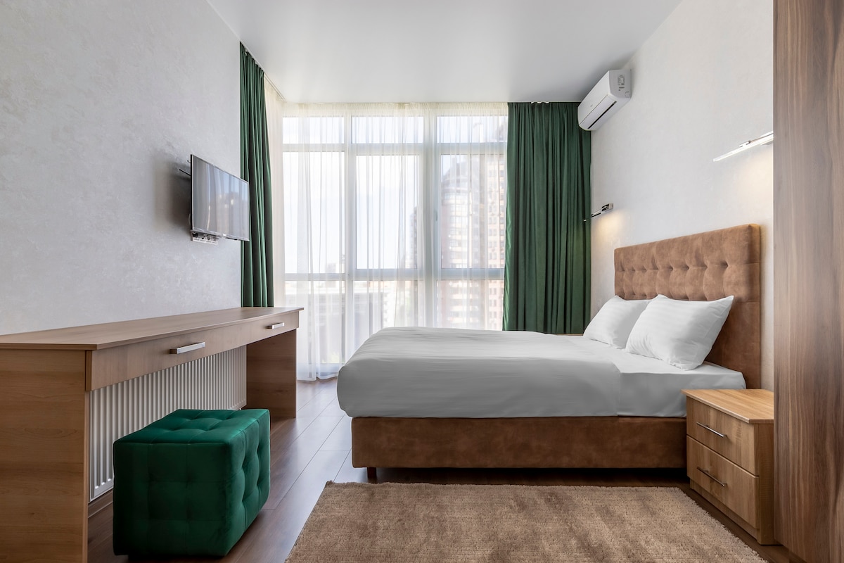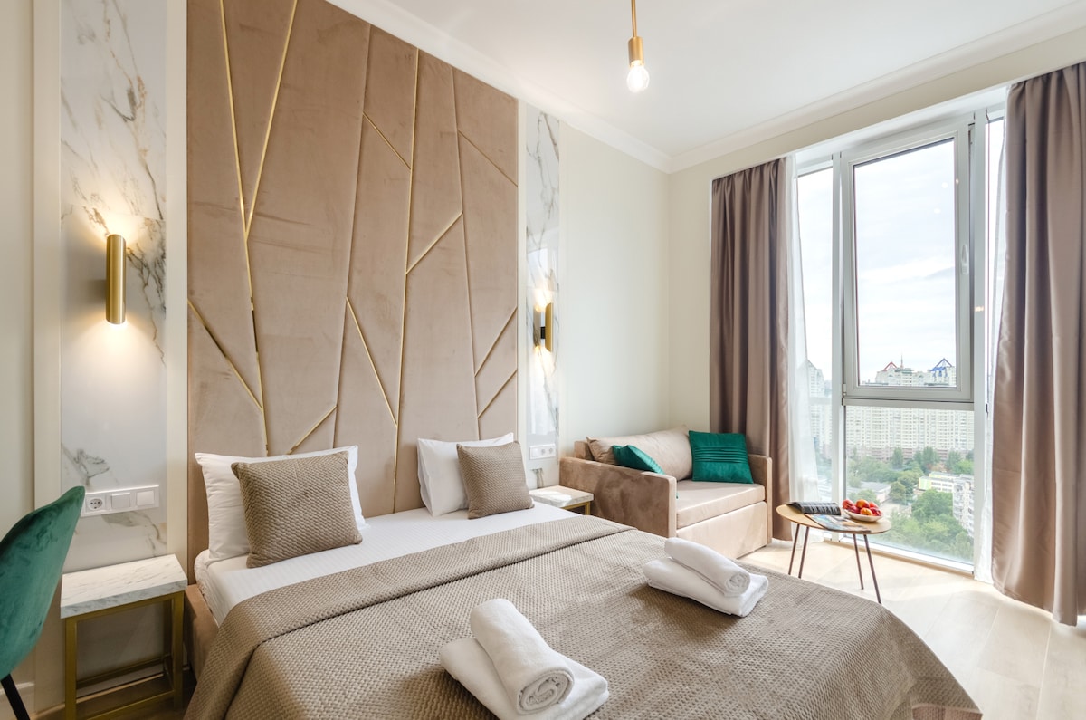 바라스포츠 시티 아파트 스튜디오 골드 스타일 - 수도 중심가에 위치한 디자이너 아파트. 페체르스크의 새로운 엘리트 건물에 위치해 있으며, 지하철역에서 도보로 5분, 기차역에서 15분 거리에 있습니다. 도시의 주요 비즈니스 및 관광지가 도보 거리 내에 있습니다. 30평방미터의 면적을 가진 새로운 스튜디오 골드 스타일의 아파트에는 정교한 헤드보드, 편안한 정형외과 매트리스, 담요, 저자극 베개가 있는 대형 더블 침대가 있습니다. 이 아파트에는 눈처럼 하얀 침구, 멋진 수건, 브랜드 세면도구가 있습니다! 냉장고, 전기 스토브, 전자레인지, 주전자, 필요한 모든 기구가 갖춰진 완비된 주방이 있습니다. 금고가 있는 기능성 옷장, TV와 와이파이가 있는 직장도 있습니다. 복합 욕실에는 넓은 샤워 시설, 온수기, 헤어드라이어가 마련되어 있습니다. 최상층 아파트의 창문을 통해 바라보는 바라스포츠 스타일의 도시의 멋진 파노라마 전망을 감상하실 수 있습니다.