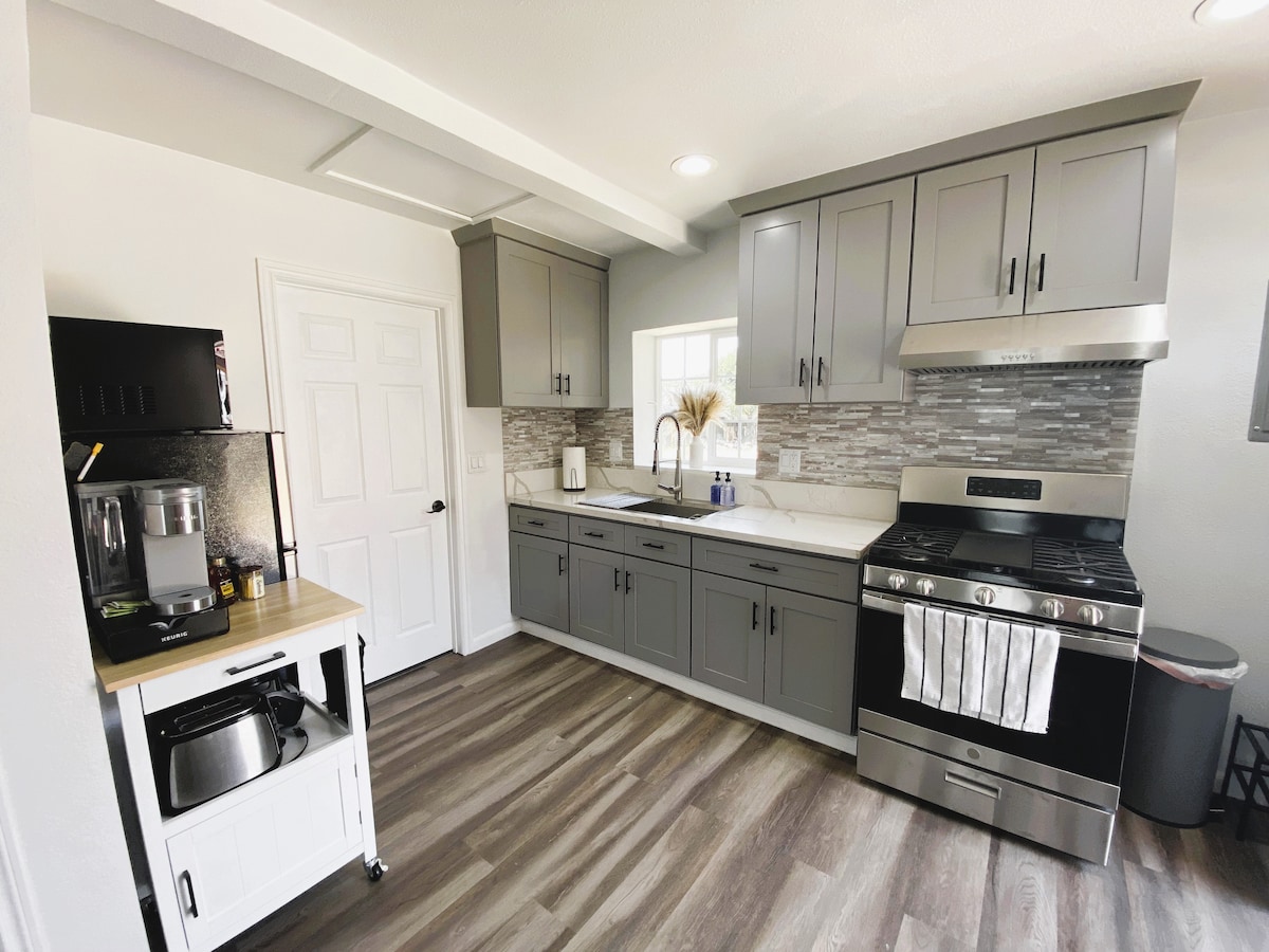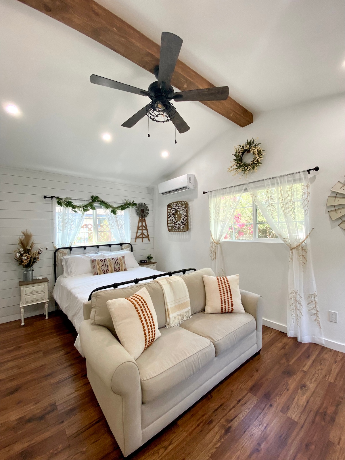 DISCOUNT LONG TERM STAYS! This chic farmhouse style studio is fully renovated and professionally designed. Our home can comfortably fit up to 4 people. The home includes pull down blackout shades throughout, queen sized memory foam bed, A/C & heating unit, printer, fast Wi-Fi, Cable TV, 65 inch Smart TV, fully stocked kitchen with all cookware and basic spices, plush linens, shampoo/conditioner/body wash, spacious bathroom with large walk-in shower, and laundry basket with in-unit washer/dryer.