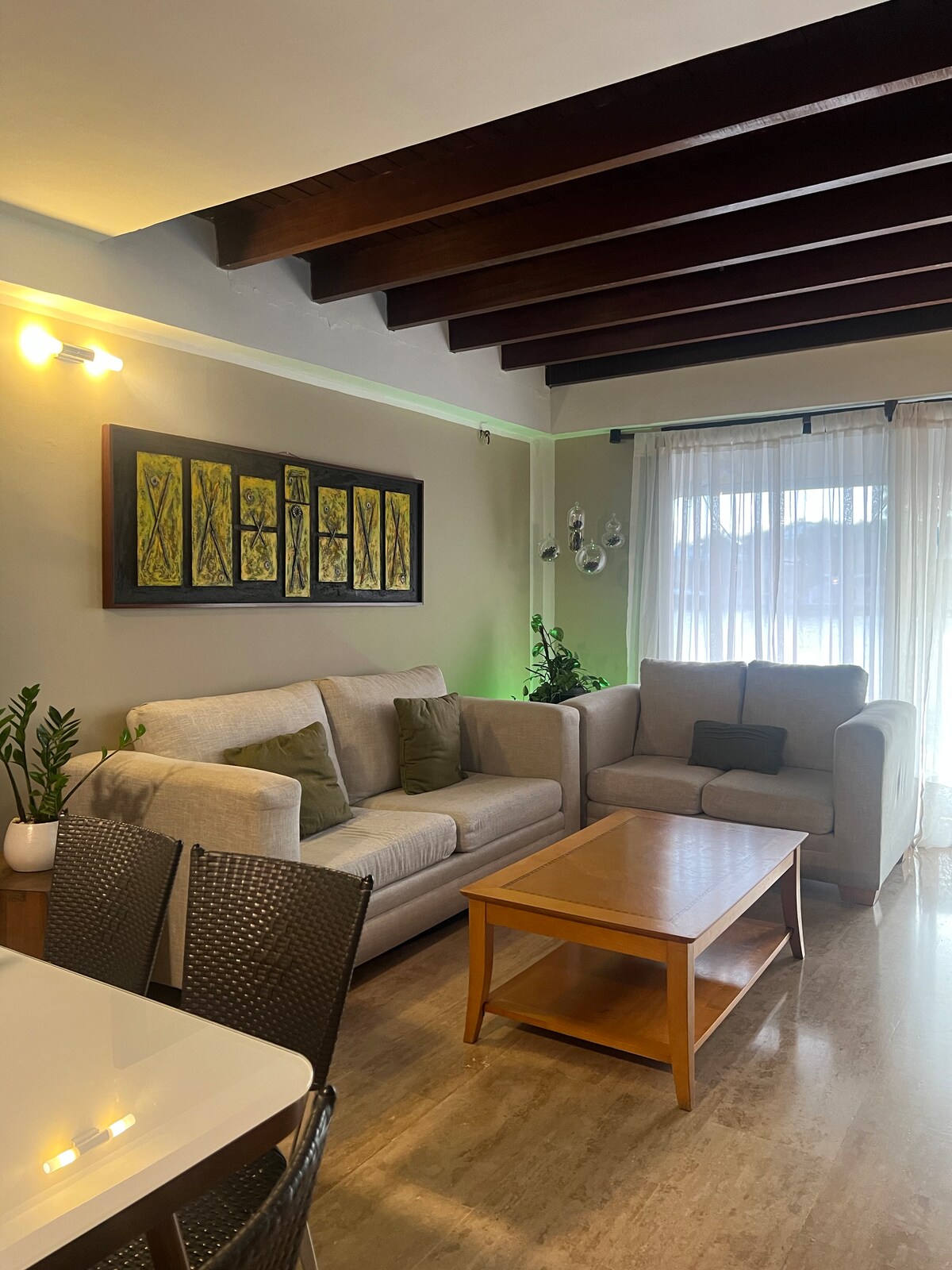 Hermoso apartamento vacacional ideal para familia o amigos. Dispone de Internet fibra óptica 200 megas, habitación principal con cama queen, clóset, baño y Smart TV; segunda habitación con 2 camas individuales y clóset; baño de visitas, cocina equipada, sala con desayunador y aire central. La residencia ofrece piscina, caney, parque infantil, estacionamiento y vigilancia 24/7.