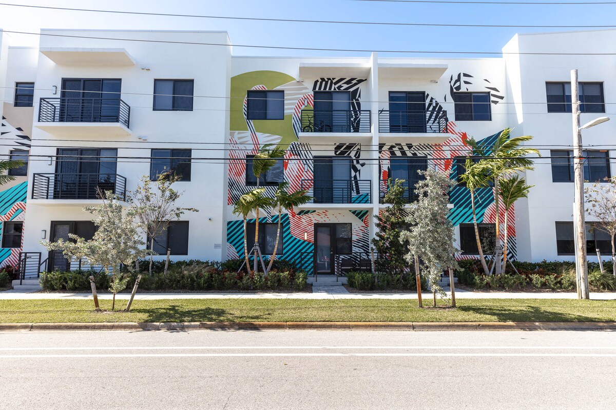 Vibrant art inspired 1b 1ba centrally located with dual entrance, patio -Self check-in -Onsite Gym -300Mbps WiFi Quick access to hospitals -Brightline rail -6 min Palm Beach -5 min to PBl -4 min Rosemary Sq -paid parking $8/day