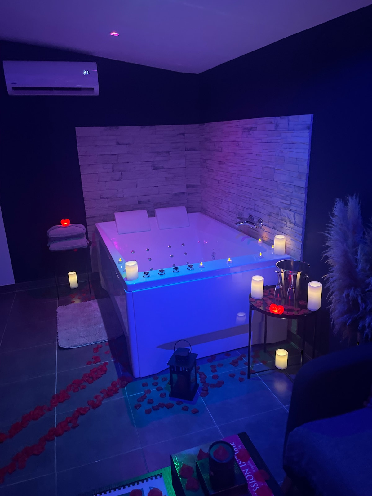 ✨ Bienvenue dans notre Love Room, un cocon sensuel pensé pour les amoureux. ✨ Plongez dans une ambiance tamisée grâce aux jeux de lumière LED, détendez-vous dans la balnéo , laissez-vous tenter par la balançoire, nos jeux et accessoires érotiques. Profitez d’un lit King Size, TV 165 cm , barre de son , d’une cheminée chaleureuse et d’une petite cave à vin. Le petit déjeuner est inclus. Terrasse ensoleillée et un parking gratuit. Une expérience inoubliable, entre charme, évasion et complicité