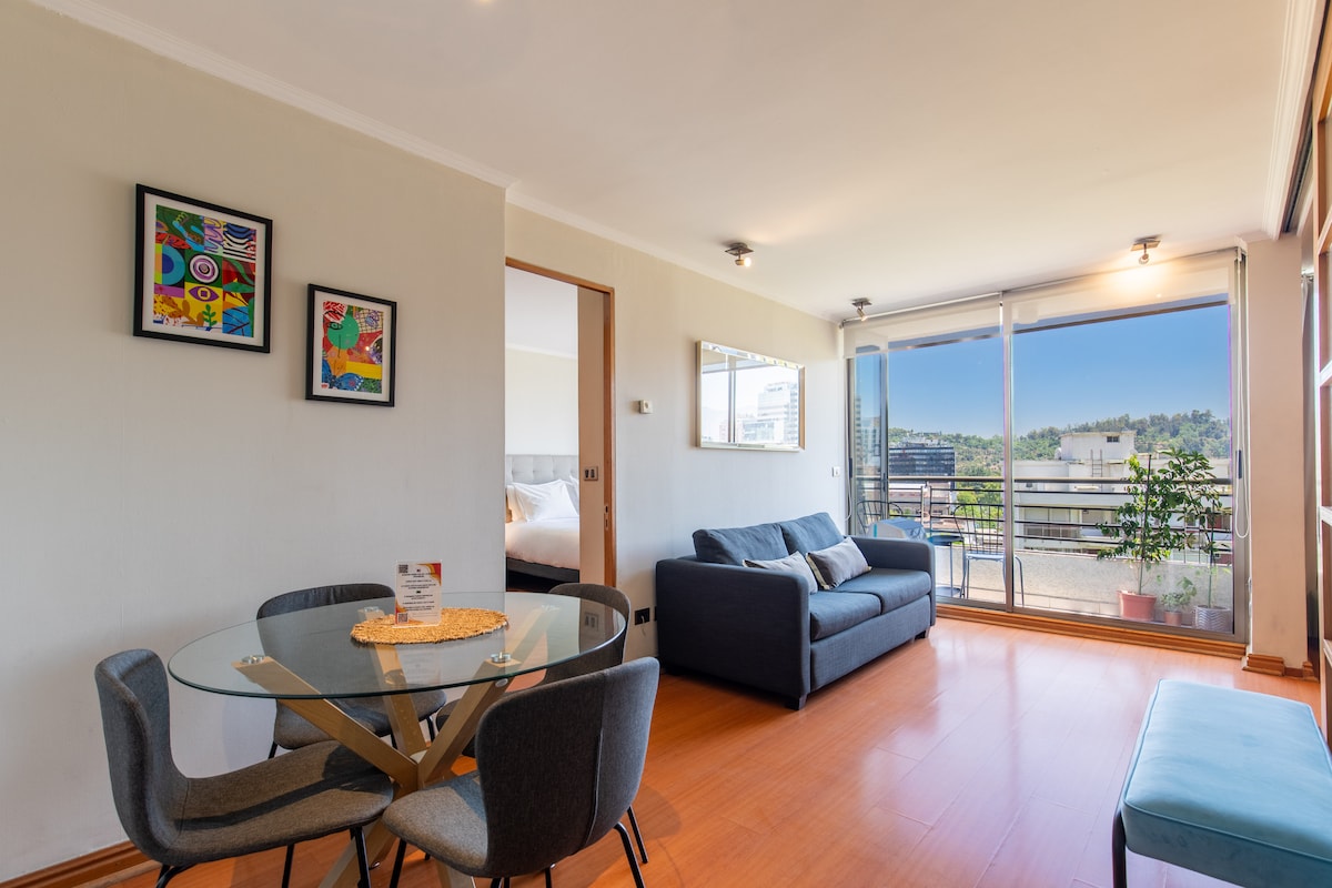 El departamento estรก en un noveno piso y tiene una vista privilegiada hacia el poniente, cuenta con una ubicaciรณn inmejorable en el corazรณn de Providencia, a pasos del centro comercial "Costanera Center", y a solo dos cuadras del Metro Los Leones. El lugar estรก rodeado de restaurantes, teatros, pubs, cafรฉs, farmacias, librerรญas y salas de arte. Se ubica frente al Parque de las Esculturas, el que conecta con una ciclovรญa con el centro de Santiago a travรฉs del Parque Balmaceda y Forestal.