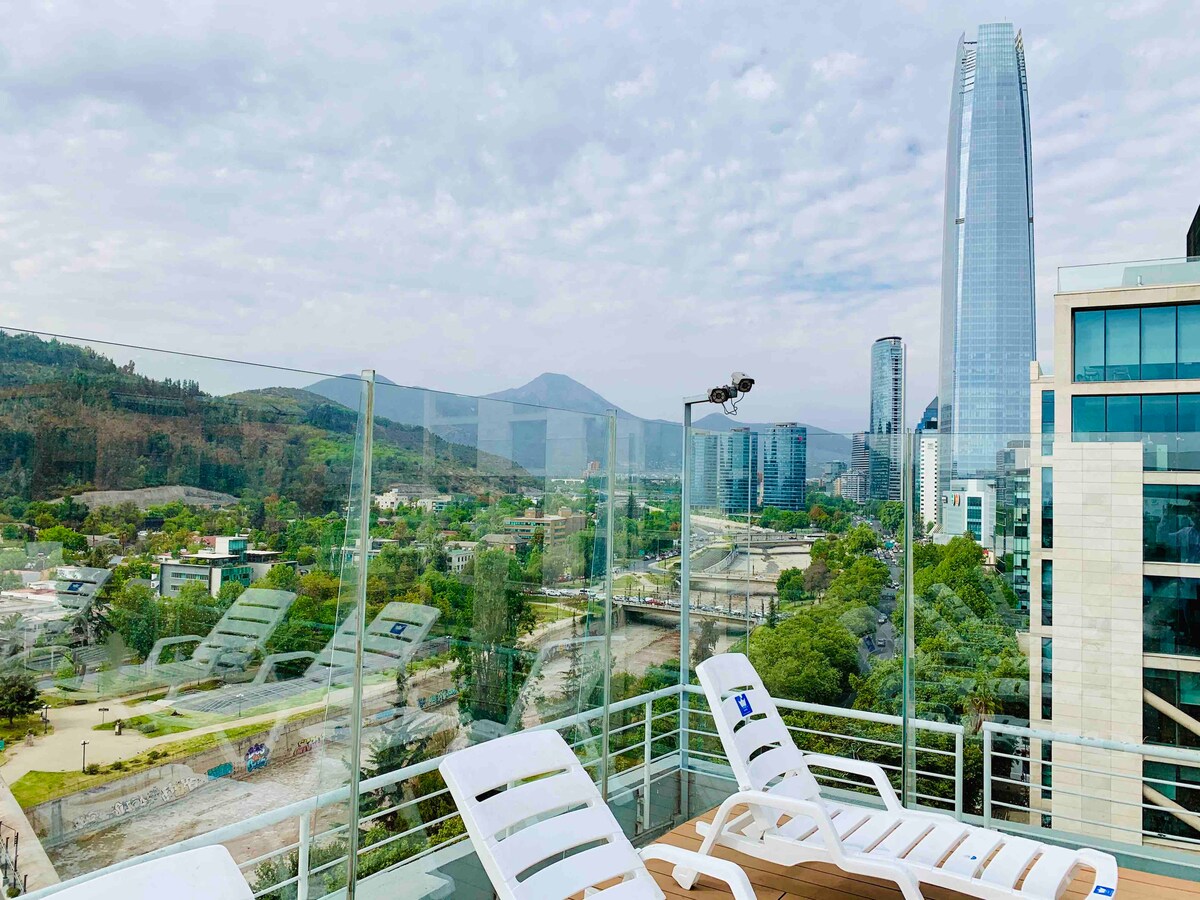 Studio, modern design, ThermoPanel for acoustic and thermal insulation, A/C. Located in the top-rated area in Santiago. Steps away from Tobalaba Metro station, from best restaurants in Santiago, from Costanera Center Mall, cafes and a supermarket. Excellent wifi, free of gas appliances, Cable TV, Smart TV 55" curved screen, nice bathroom. All in a safe neighborhood with many services. For security reasons, it is required to send us, after booking, photos of ID and selfie of each guest.