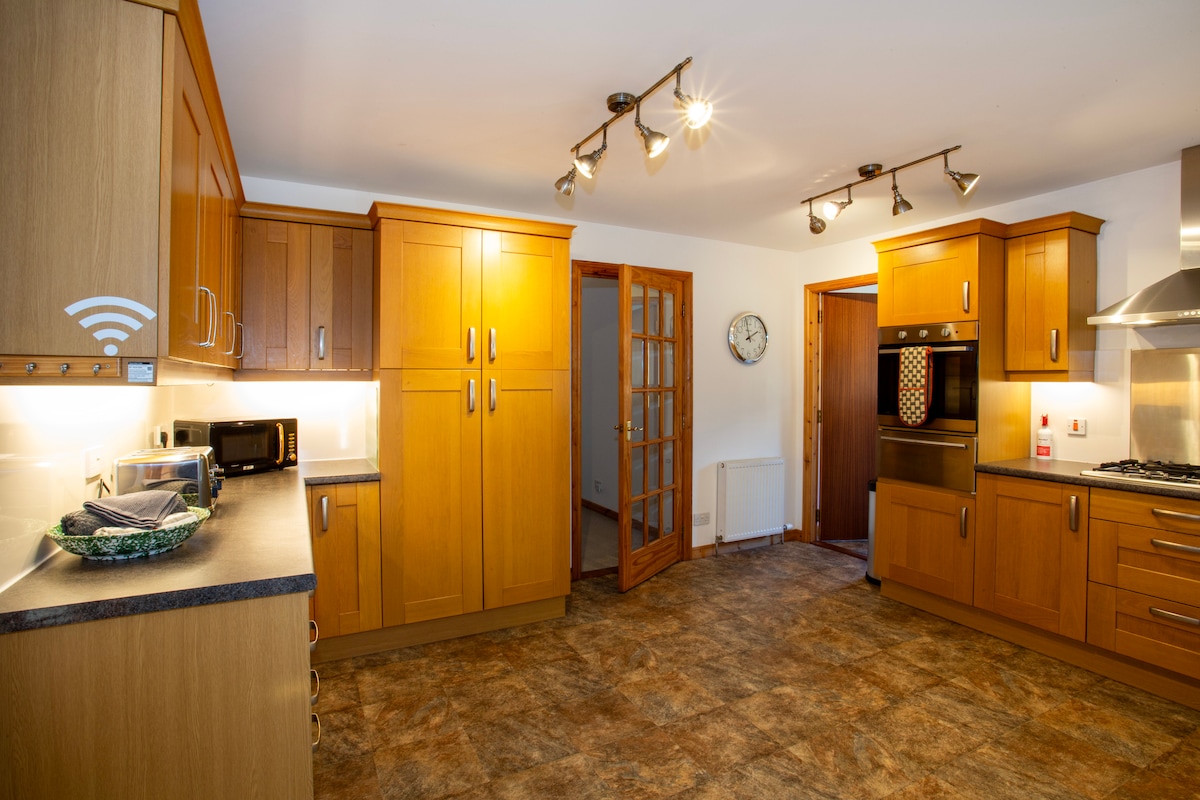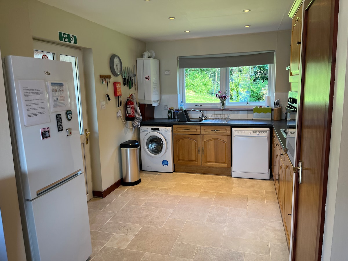 가구가 잘 갖춰진 침실 3개 현대식 단독 주택 방갈로. 6명까지 숙박 가능합니다. 환상적인 전망을 자랑합니다. 가족들이 편안하게 쉴 수 있도록 설계되었습니다. 시대를 초월한 전망을 자랑하는 21세기 숙소입니다. 매우 편안한 소파 2개가 있는 넓은 거실. 더블 침대 2개와 싱글 침대 2개. 초고속 광대역 인터넷, 4K 42인치 TV, Sky/Netflix, Xbox, 파티오, 정원. 시설이 완비된 주방, 식탁, 식기세척기, 세탁기, 건조기. 모든 공간에 조절 가능한 패널 히터. 샤워기가 있는 욕실. 전용 진입로에 차량 2대를 주차할 수 있는 오프로드 주차.